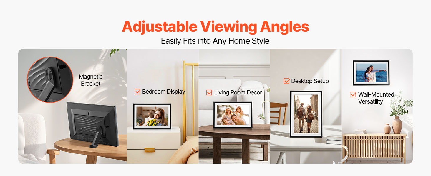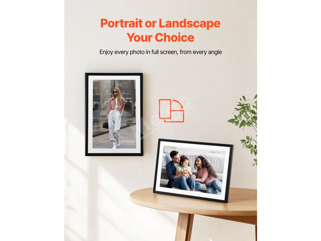 Digitálny fotoalbum automaticky otáča obsah a podporuje inštaláciu na stenu aj na stôl - ideálne do obývačky, spálne a kancelárie.