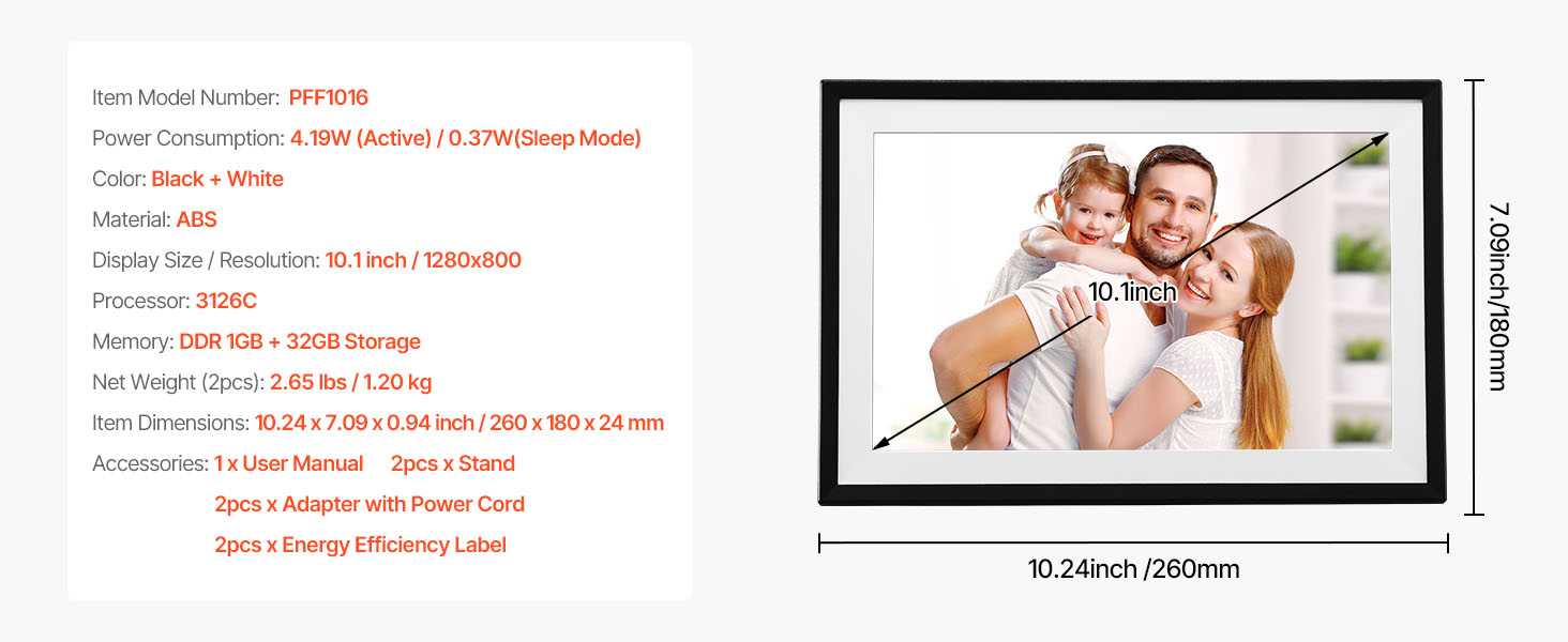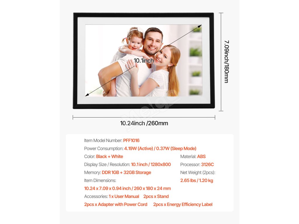 Náš digitálny rámik umožňuje bezdrôtovo zdieľať fotografie, videá a prezentácie prostredníctvom aplikácie Uhale a WiFi. Ponúka 32 GB vstavanú pamäť, ktorú možno rozšíriť na 128 GB pomocou karty SD, zatiaľ čo 10,1-palcový dotykový displej IPS s rozlíšením 1280 × 800 a automatickým otáčaním zaručuje jasné zobrazenie na celej obrazovke!