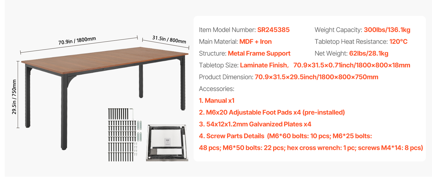 | Veľkosť stolovej dosky | Povrchová úprava laminátu,70,9x31,5x0,71 palca / 1800x800x18 mm |