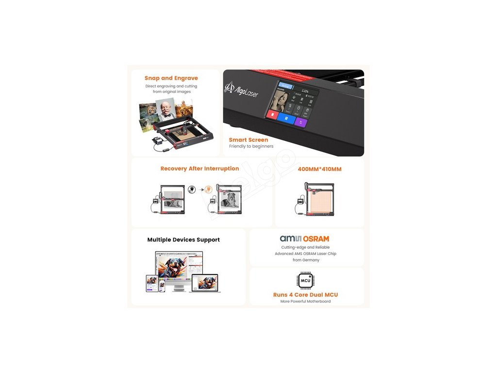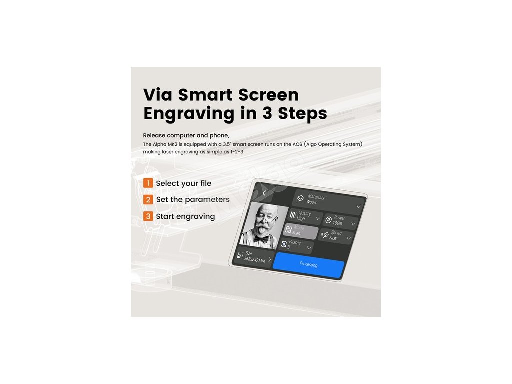 Automatické nastavenie prietoku vzduchu na základe rýchlosti a výkonu. Podporuje priame ovládanie prostredníctvom obrazovky, aplikácie AlgoLaser APP, softvéru LightBurn a LaserGRBL.