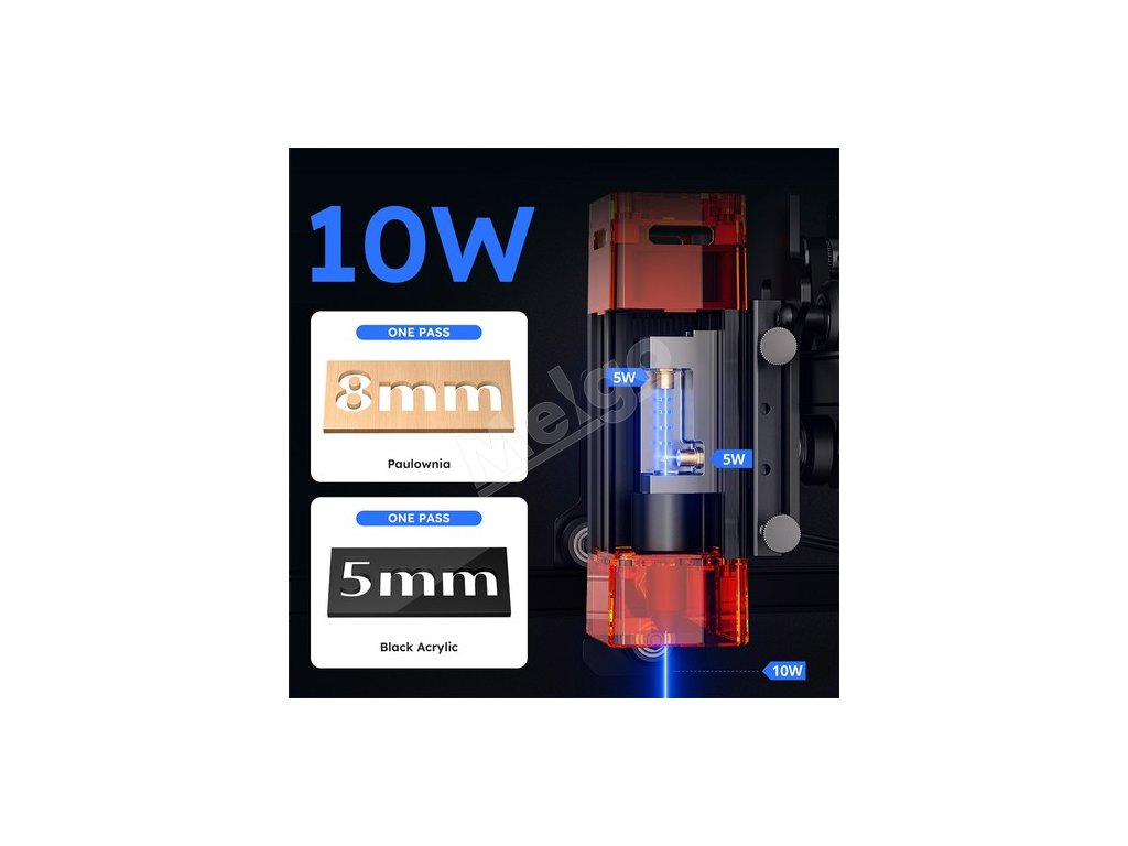 Tento laserový gravírovací stroj má zabudovanú skrutkovaciu tyč a dlhú ohniskovú vzdialenosť. Laserová rezačka má výkon 10000 mW a kombinuje vysokoenergetické rezanie a presné gravírovanie súčasne. Rýchlosť gravírovania môže dosiahnuť 400 mm/s, čo výrazne skracuje čas gravírovania a umožňuje jednoduché spracovanie rôznych materiálov.