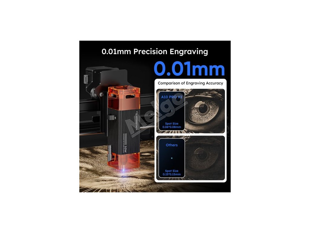 Laserový rezací stroj Atomstack A10 Pro V2 je vylepšený model, ktorý je výkonnejší, inteligentnejší a stabilnejší ako ostatné. Využíva technológiu dvojitého tlakového bodového spojenia a výkon lasera dosahuje 10000 mW. Má jedinečnú technológiu kompresie bodu a veľkosť bodu je len 0,06*0,08 mm. (Úroveň výstupného výkonu lasera: 10000 mW, trieda lasera: 4)