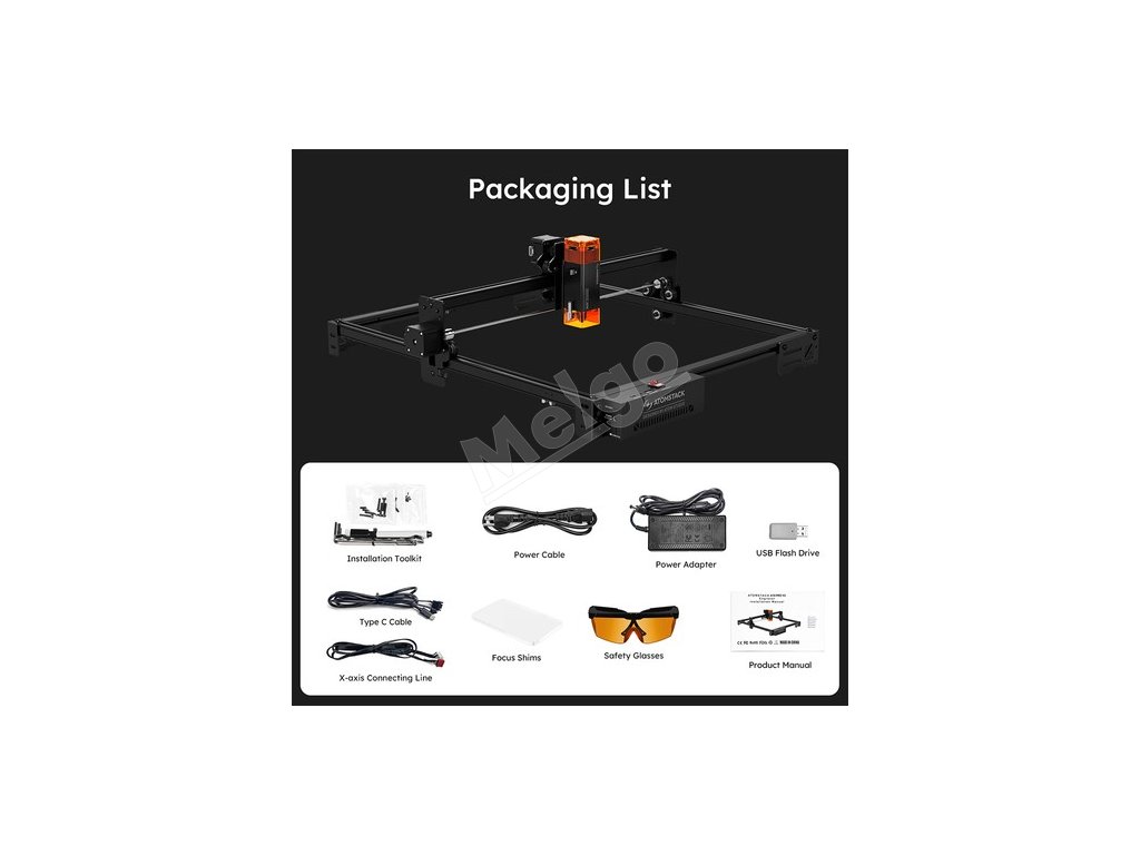 | Obsah balenia | 1 x Laserový gravírovací stroj 1 x Súprava inštalačného náradia 1 x Napájací kábel 1 x Napájací adaptér 1 x USB Flash disk 1 x Kábel typu C 1 x Spojovacia šnúra osi X 1 x Podložky na zaostrenie 1 x Ochranné okuliare 1 x Návod na použitie 1 x Laserové lôžko H44 1 x Rotačný valec G3 Pro 1 x Kryt FC1 |