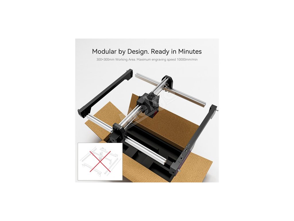 Zariadenie využíva modulárny dizajn, ktorý umožňuje používateľom dokončiť inštaláciu a spustenie do 10 minút aj bez predchádzajúcich skúseností. Vďaka strednej pracovnej ploche 300×300 mm je vhodný na použitie doma, v štúdiách, garážach alebo trhových stánkoch, takže je ideálnou voľbou pre začiatočníkov aj profesionálov, ktorí potrebujú kompaktné, ale výkonné gravírovacie zariadenie.