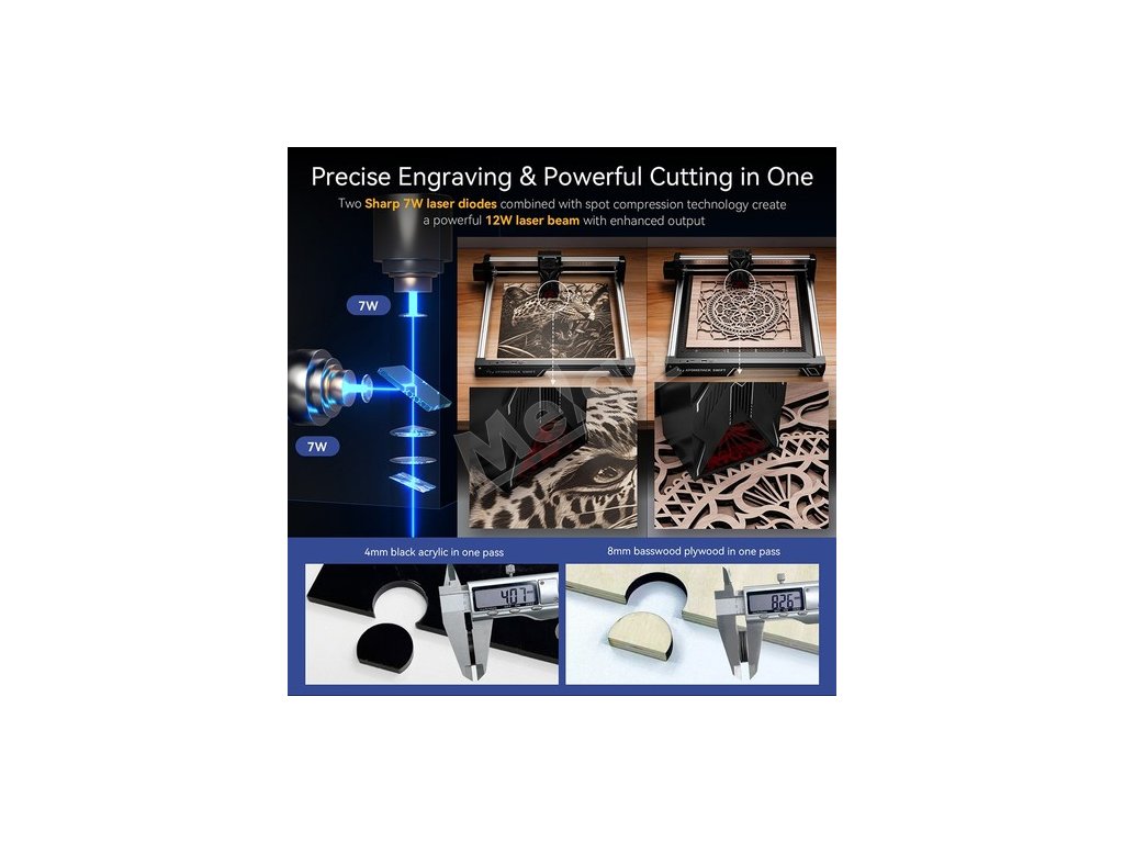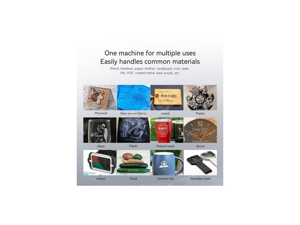 Stroj je k dispozícii vo verziách so 7W a 12W diódovým laserom, pričom oba dokážu spracovať širokú škálu materiálov, ako je drevo, bambus, papier, koža, kartón, korok, bridlica, MDF, potiahnutý kov a tmavý akryl. S voliteľným infračerveným laserovým modulom podporuje aj vysoko presné gravírovanie na kov, kožu a plast, čo používateľom umožňuje zvládnuť rôzne aplikácie v kreatívnych, komerčných alebo priemyselných projektoch.