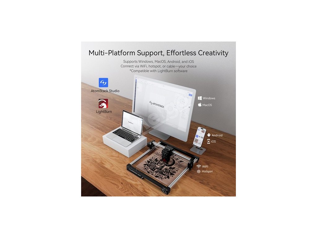 Táto gravírka podporuje viacero platforiem vrátane systémov Windows, macOS, Android a iOS. Ponúka flexibilné možnosti pripojenia, napríklad Wi-Fi, hotspot a káblové pripojenie USB, čím zabezpečuje bezproblémovú prevádzku v akomkoľvek prostredí. Používatelia môžu stroj ovládať prostredníctvom aplikácie AtomStack APP alebo používať profesionálny softvér, ako je LightBurn, na pokročilú správu dizajnu a gravírovania.