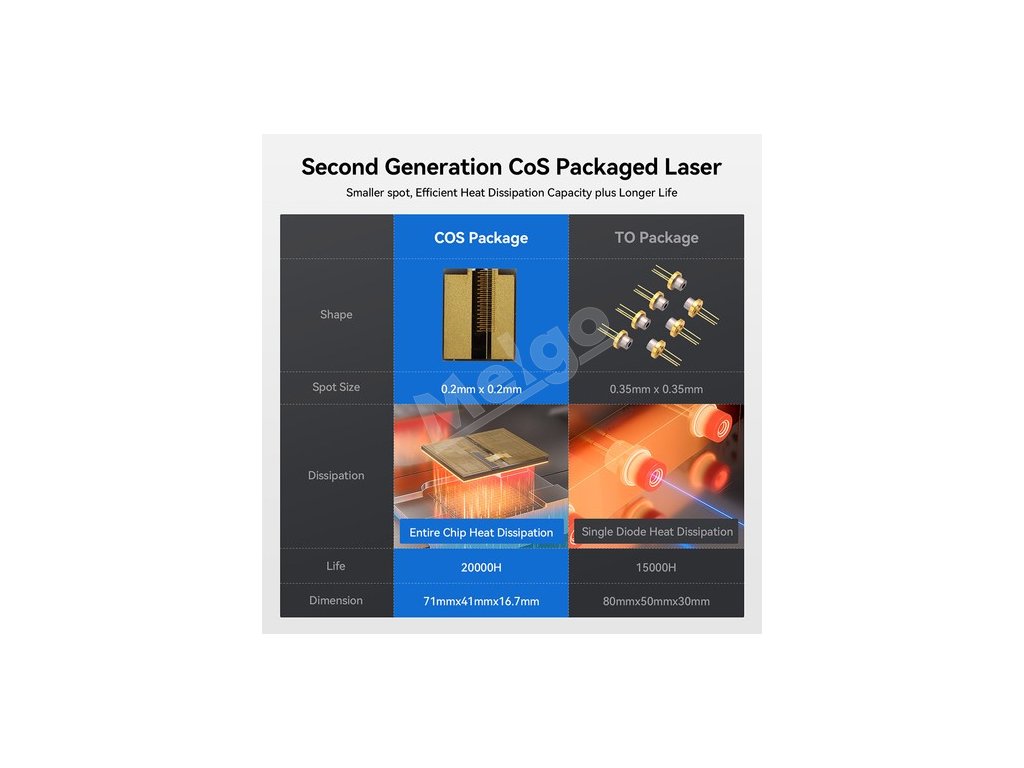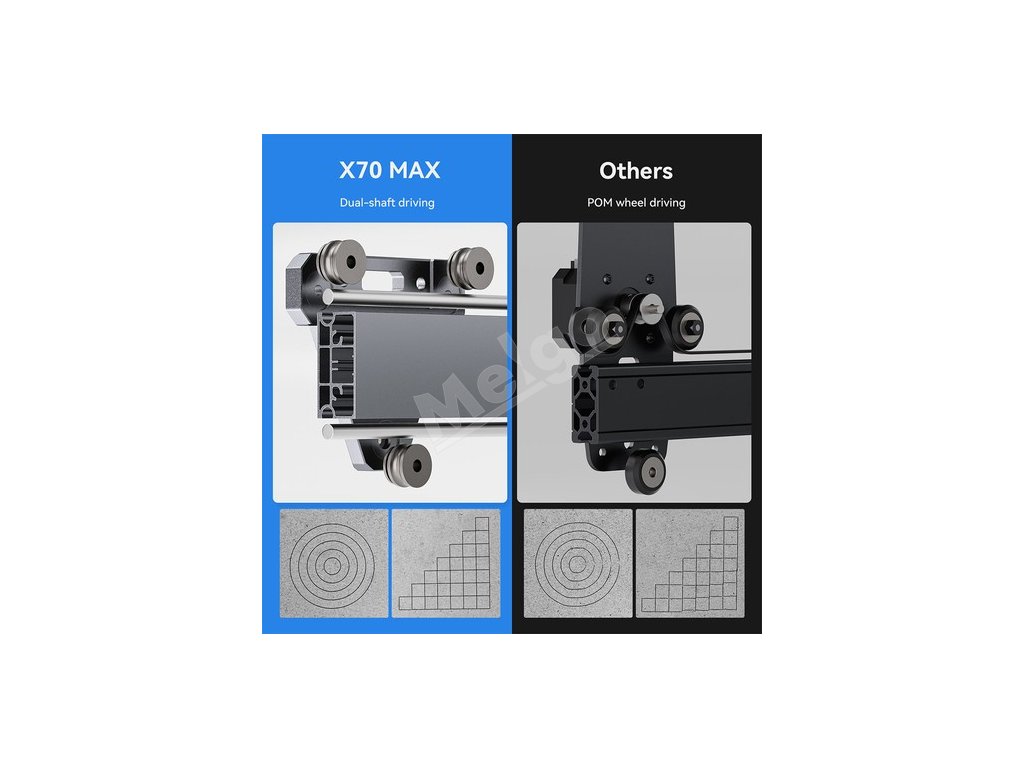 Trojosový mechanizmus vybavený dvojosovým koľajnicovým systémom s nízkym ťažiskom zaručuje vysokorýchlostnú stabilitu (až 400 mm/s) a tichú prevádzku, čo je ideálne na náročné úlohy gravírovania a rezania.