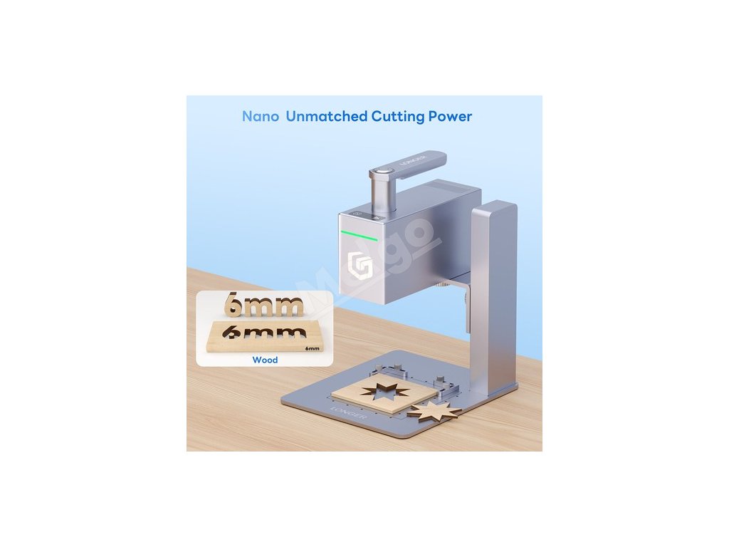 Vybavený laserovým modulom s optickým výkonom 6 W a pokročilou laserovou technológiou Nano ľahko reže 6 mm (0,24") basglejové drevo a 4,5 mm (0,17") akryl, čím dosahuje presné a efektívne výsledky.