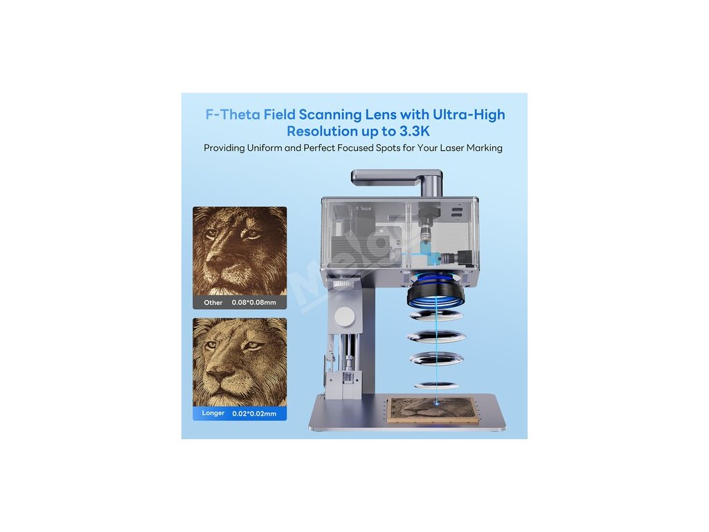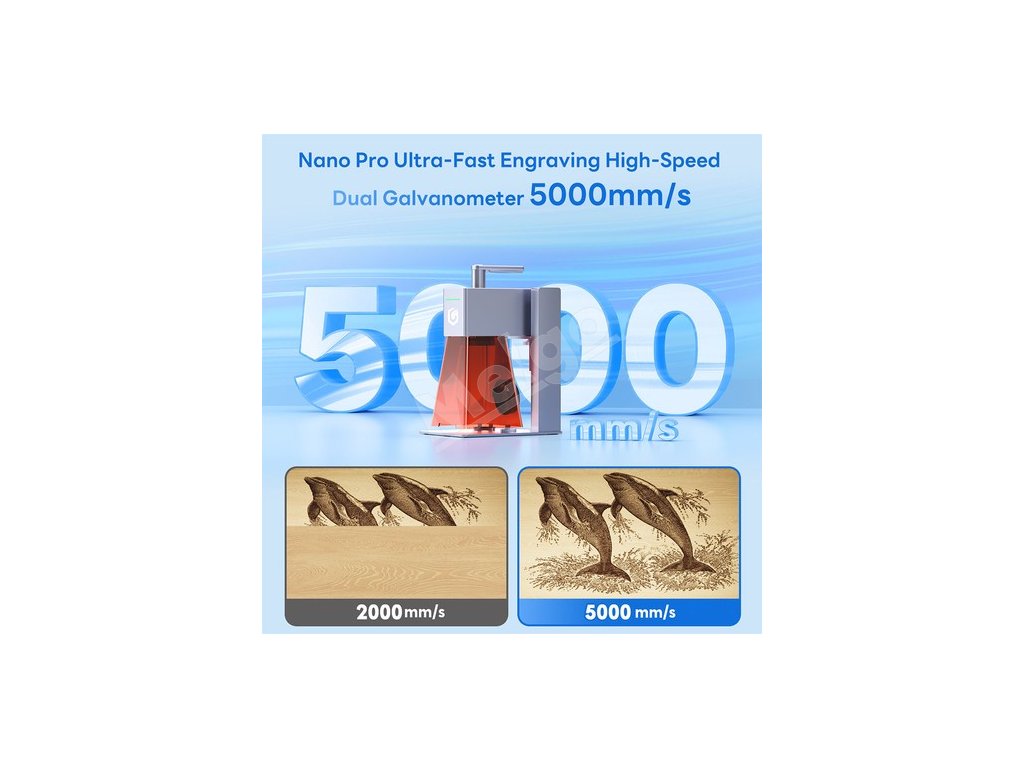 Nano Pro je vybavený zrkadlami s priemyselným poľom a optickou korekciou, ktoré zvyšujú kvalitu gravírovania a dosahujú presnosť až 0,01*0,01 mm. Vďaka najnovšej vysokorýchlostnej galvanometrickej technológii ponúka rýchlosť náhľadu až 32 000 mm/s a možnosť vysokorýchlostného gravírovania až 5000 mm/s.