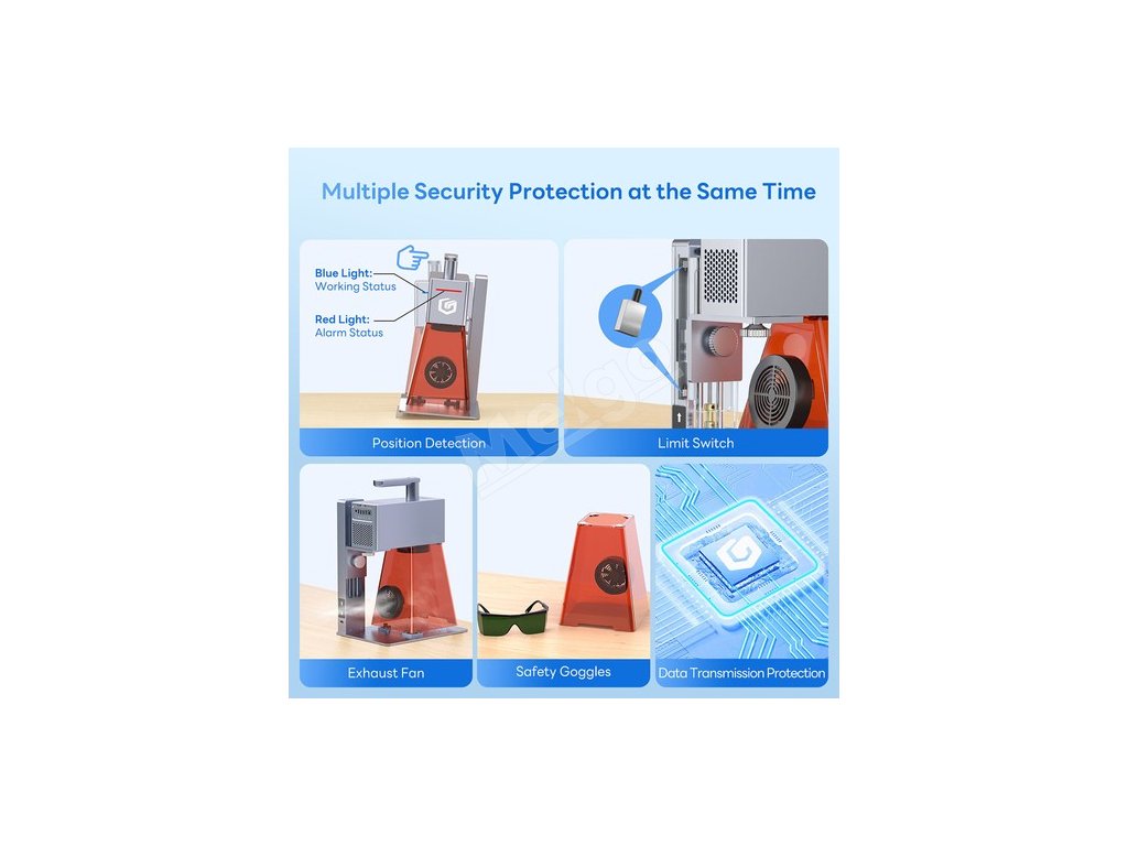 Laserové gravírovacie zariadenie Nano Pro je vybavené ochranným krytom a ochrannými okuliarmi, ktoré účinne zabraňujú podráždeniu očí a chránia vaše oči. Jeho konštrukcia ochrany proti pohybu automaticky vypne stroj v prípade abnormálnych otrasov počas pohybu zariadenia, aby sa zaistila bezpečnosť, a funkcia tepelnej ochrany zastaví stroj, ak zistí prehriatie plameňa v gravírovacej oblasti.
