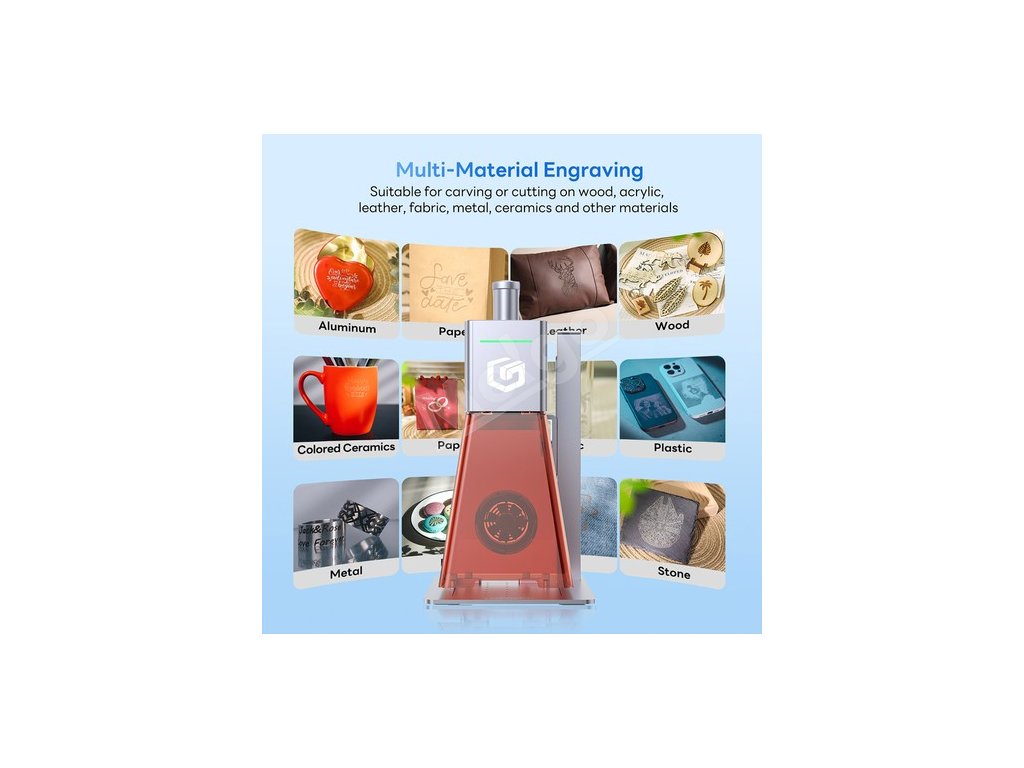 Z hľadiska výkonu je tento gravírovací stroj známy svojou presnosťou, rýchlosťou a schopnosťou manipulácie s materiálom, s presnosťou gravírovania až 0,02 mm pri 12W variante a 0,02 mm pri 6W variante, a navyše rýchlosťou až 5000 mm/s. Dokáže prispôsobiť širokú škálu predmetov, od fliaš na víno až po drevené podložky, čím demonštruje svoju prispôsobivosť na osobné a firemné použitie.