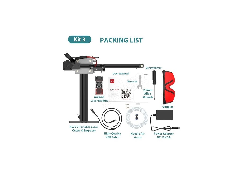 | Obsah balenia: | Gravírovací stroj NEJE 5, Laserový modul A40640, 4 matice, okuliare, kľúč v tvare L, USB kábel, malý kľúč, napájací adaptér 12V3 |
