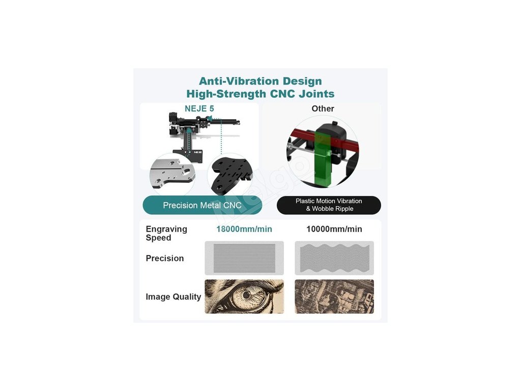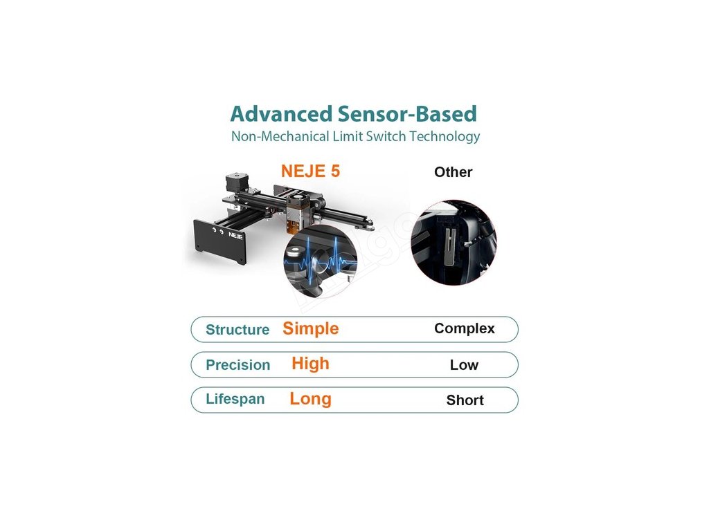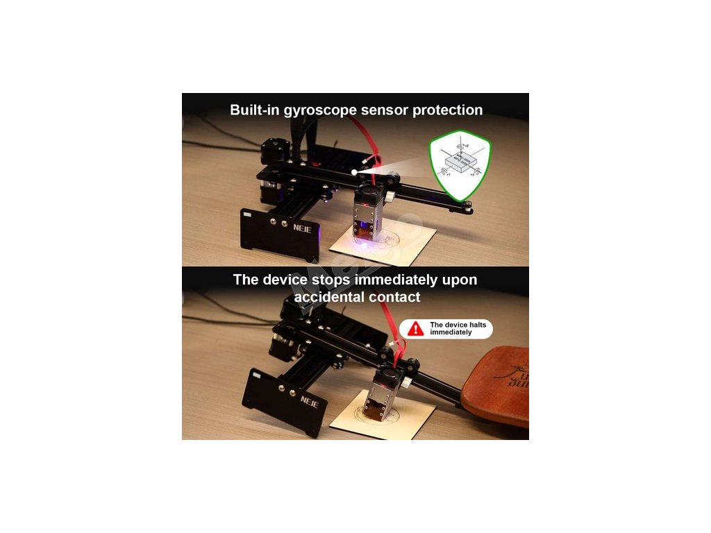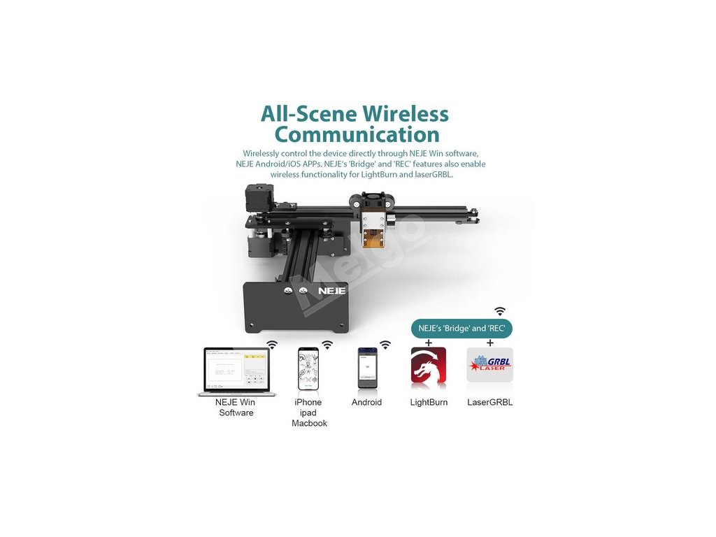 | Softvér & Servis | LaserGRBL, LightBurn, softvér NEJE Win (profesionálny viacvrstvový ovládací softvér, ktorý obsahuje funkciu NEJE "REC" a funkciu NEJE "Bridge")aplikácia NEJE (aplikácia pre Android, nástroj na bezdrôtový prenos z telefónu Android na počítač; APP pre iPhone a Mac)NEJE Cloud (platforma pre služby obsahu)NEJE OTA (služba aktualizácie softvéru a firmvéru cez internet) |