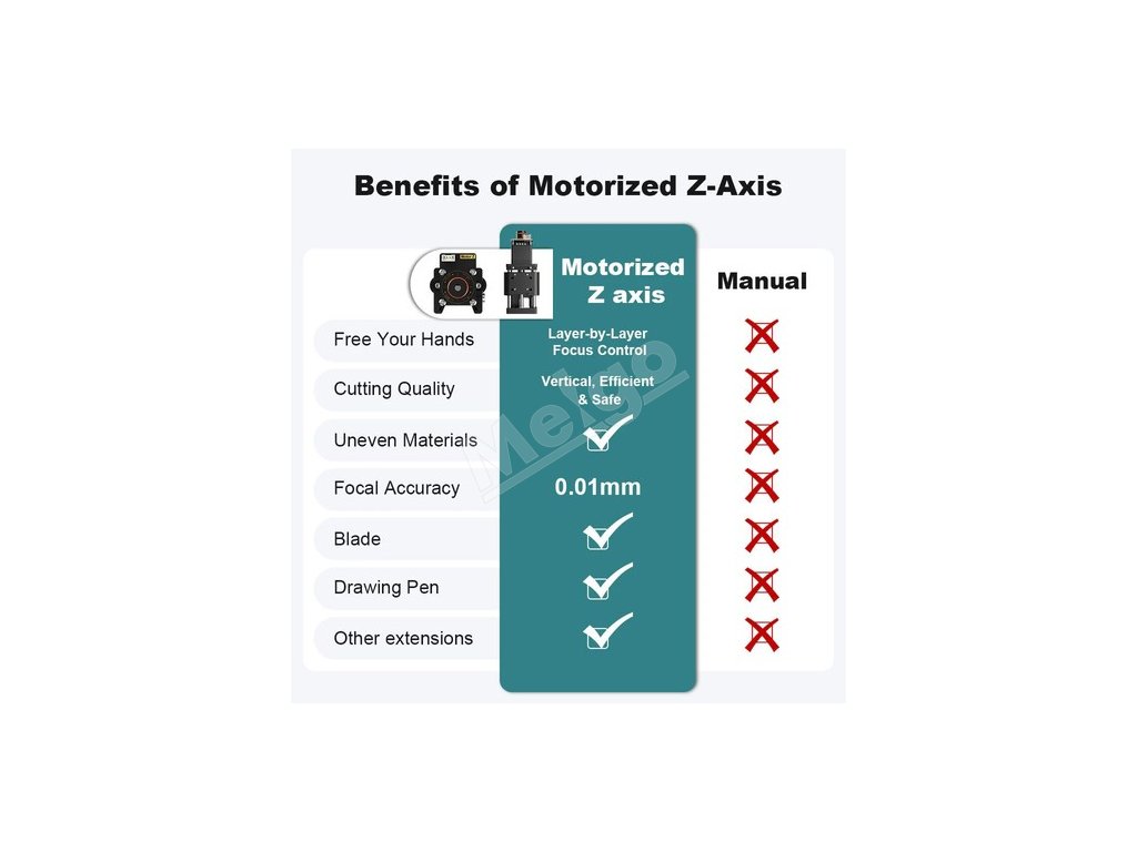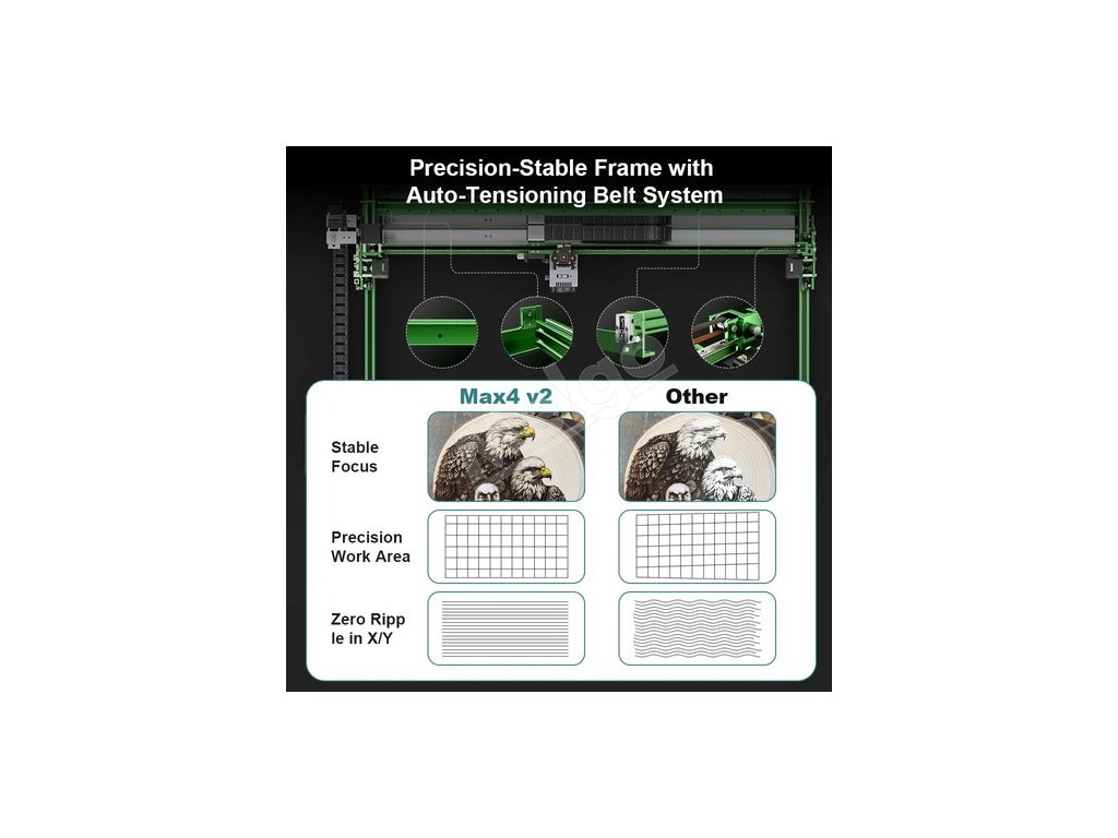 Laserové gravírovacie zariadenie NEJE MAX 4 je vybavené novou vysoko presnou (0,001 mm) osou Z, ktorá umožňuje zmenu polohy v rozsahu 45 mm. Ohnisková vzdialenosť každej vrstvy sa dá nastaviť v softvéri Lightburn a hrubšie materiály (20-25 mm) sa dajú automaticky a efektívne rezať pre každú vrstvu nastavením výšky osi Z. Gravírovacia plocha s rozmermi 750 (X)*460 (Y)*45 (Z) mm vám umožňuje nestanoviť žiadne obmedzenia vašej kreativity.