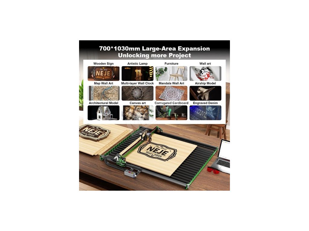 | Softvér & Servis | LaserGRBL, LightBurn, softvér NEJE Win (profesionálny viacvrstvový ovládací softvér, ktorý obsahuje funkciu NEJE "REC" a funkciu NEJE "Bridge")aplikácia NEJE (aplikácia pre Android, nástroj na bezdrôtový prenos z telefónu Android na počítač; APP pre iPhone a Mac)NEJE Cloud (platforma pre služby obsahu)NEJE OTA (služba aktualizácie softvéru a firmvéru cez internet) |