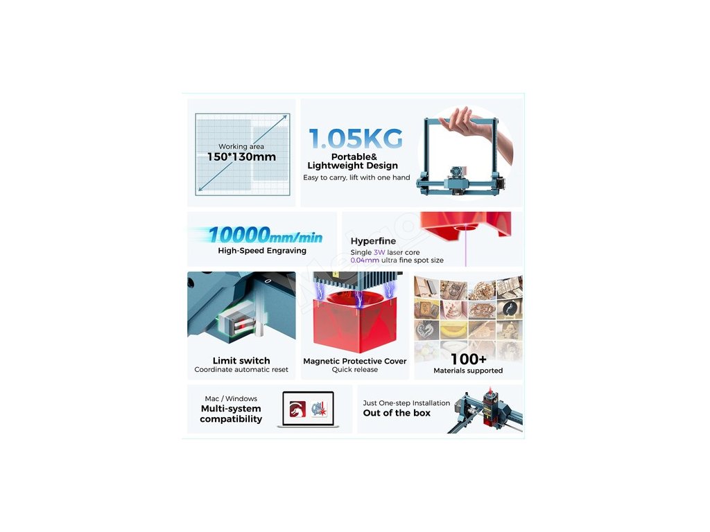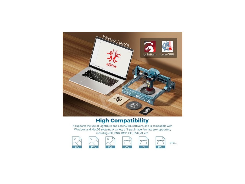 Môže sa používať s profesionálnym softvérom na laserové gravírovanie LightBurn a LaserGRBL a je kompatibilný so systémami Windows a MacOS, čo vám umožní plynulú prácu. Okrem toho má silnú funkciu vstupu obrázkov, ktorá podporuje viacero bežných formátov obrázkov, ako sú JPG, PNG, BMP, GIF, SVG, AI atď. a poskytuje bohatý a rôznorodý výber materiálov pre vaše kreatívne nápady, ktoré spĺňajú potreby použitia v rôznych scenároch.