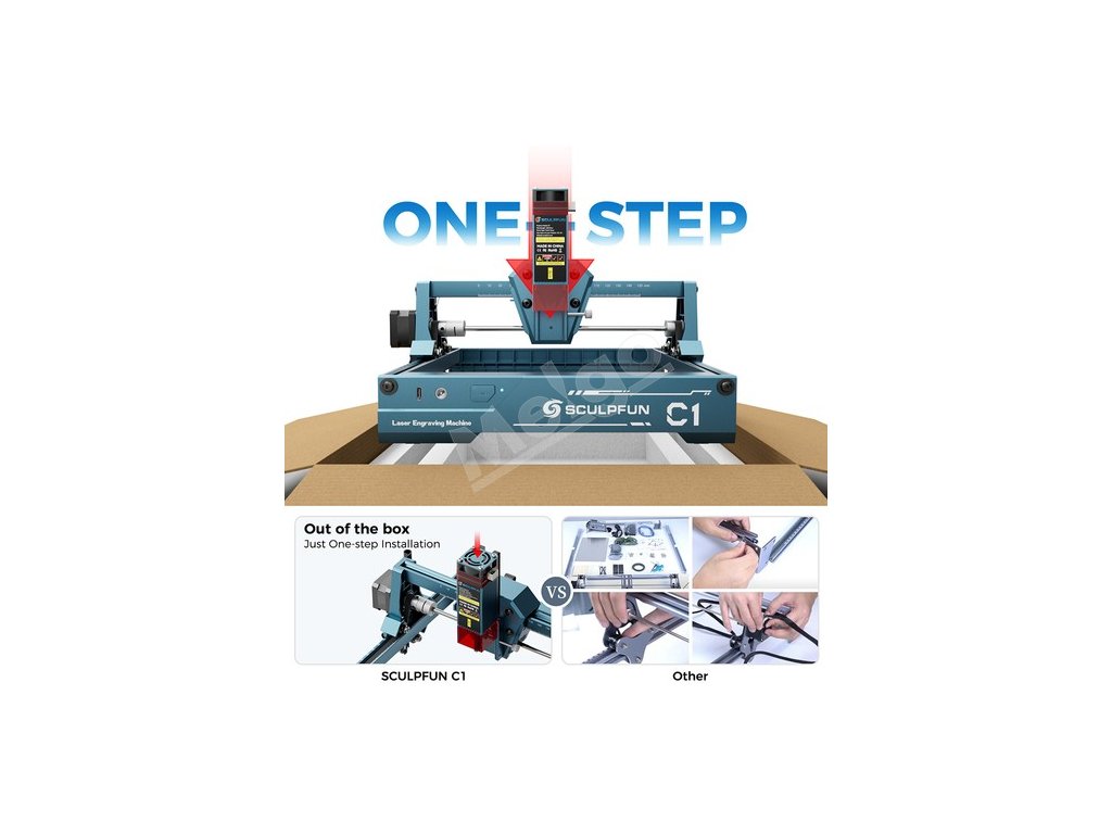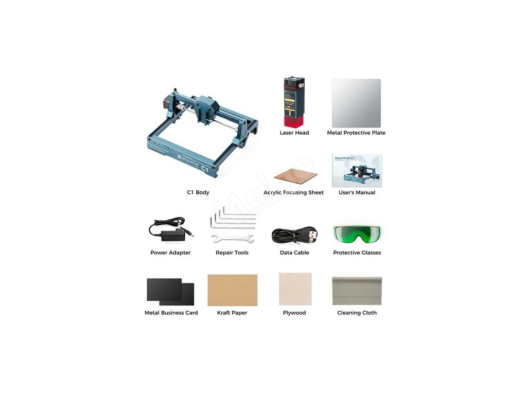 Obsah balenia: | Zariadenie C1, Laserová hlava, Návod na použitie, Dátový kábel USB, Adaptér, Akrylová zaostrovacia fólia, Súprava nástrojov, Kra |