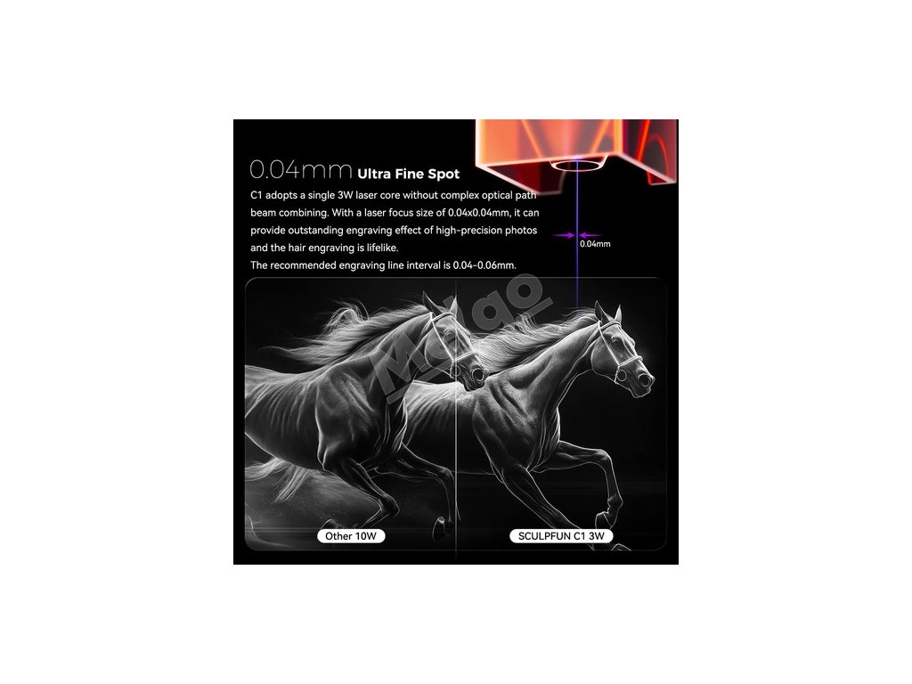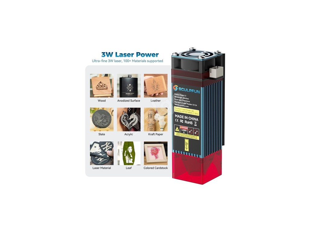 Laser C1 využíva jedno 3W laserové jadro s mimoriadne jemným bodom s veľkosťou 0,04 mm. Laserová hlava s nízkym výkonom udržiava ultrajemný laserový výstup, čo používateľom umožňuje vytvárať detailné gravírovanie na každom kuse.