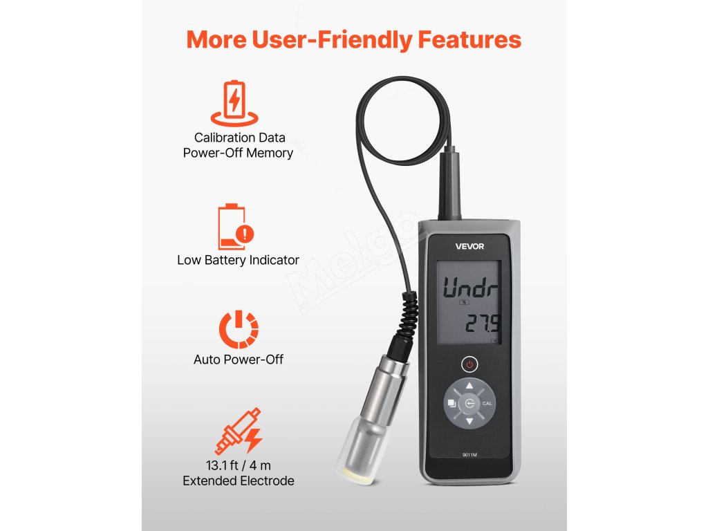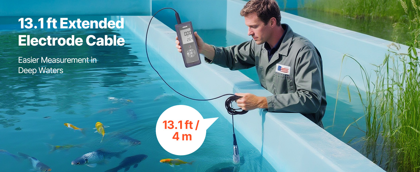 Elektróda s dĺžkou 13,1 stopy ľahko dosiahne do hlbokých rybníkov, studní alebo veľkých vodných nádrží. Náš tester rozpusteného kyslíka uľahčuje prácu v teréne a umožňuje vám ľahko zhromažďovať presné údaje.