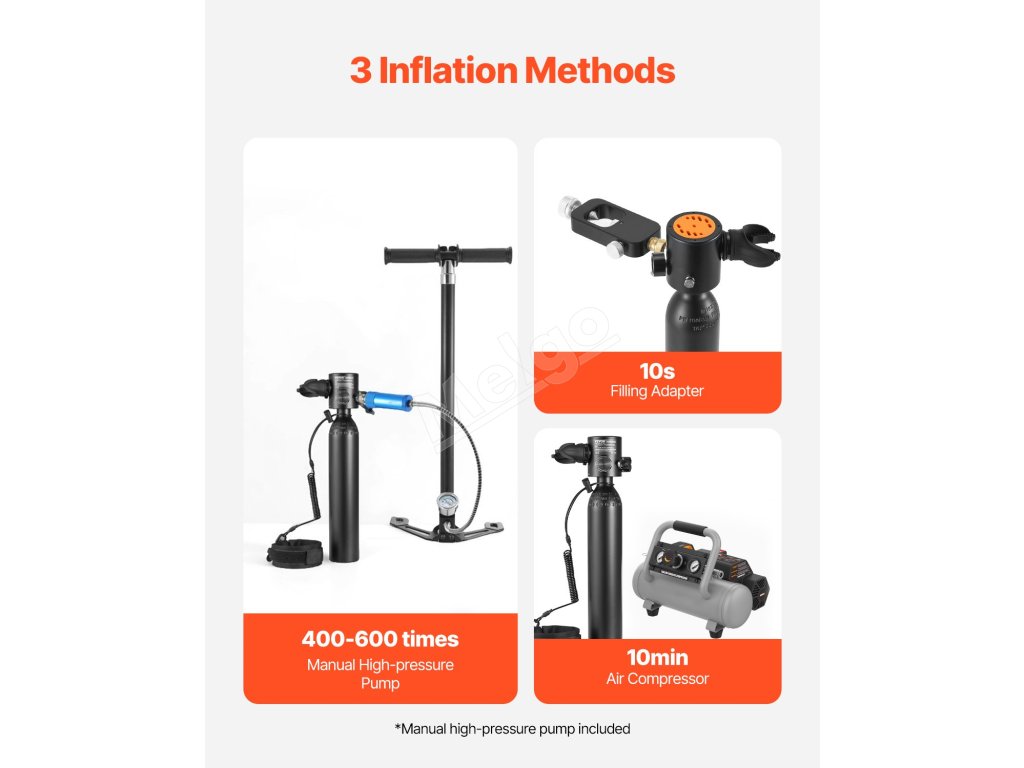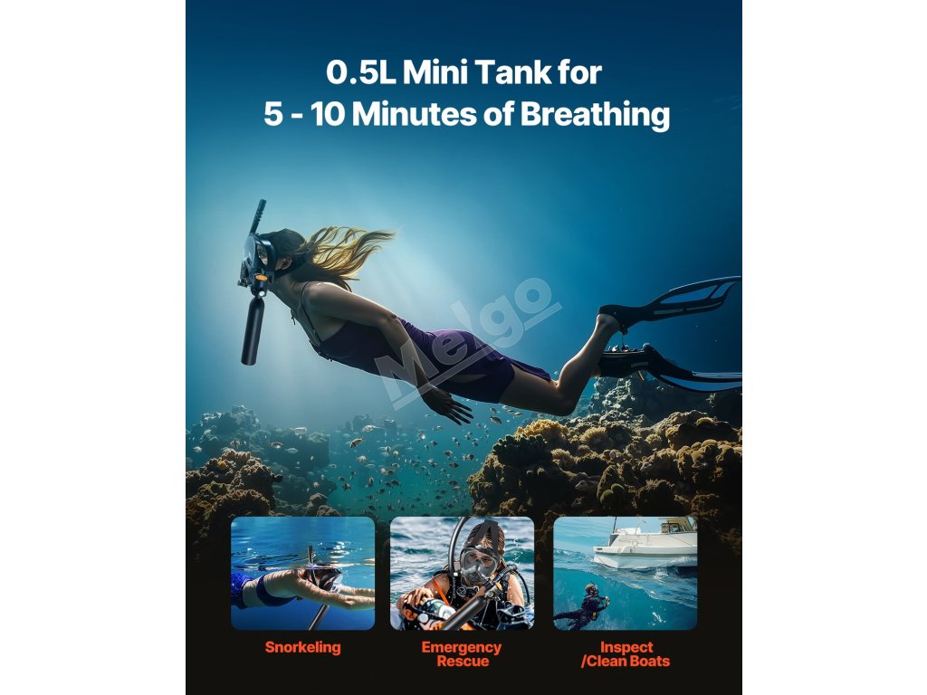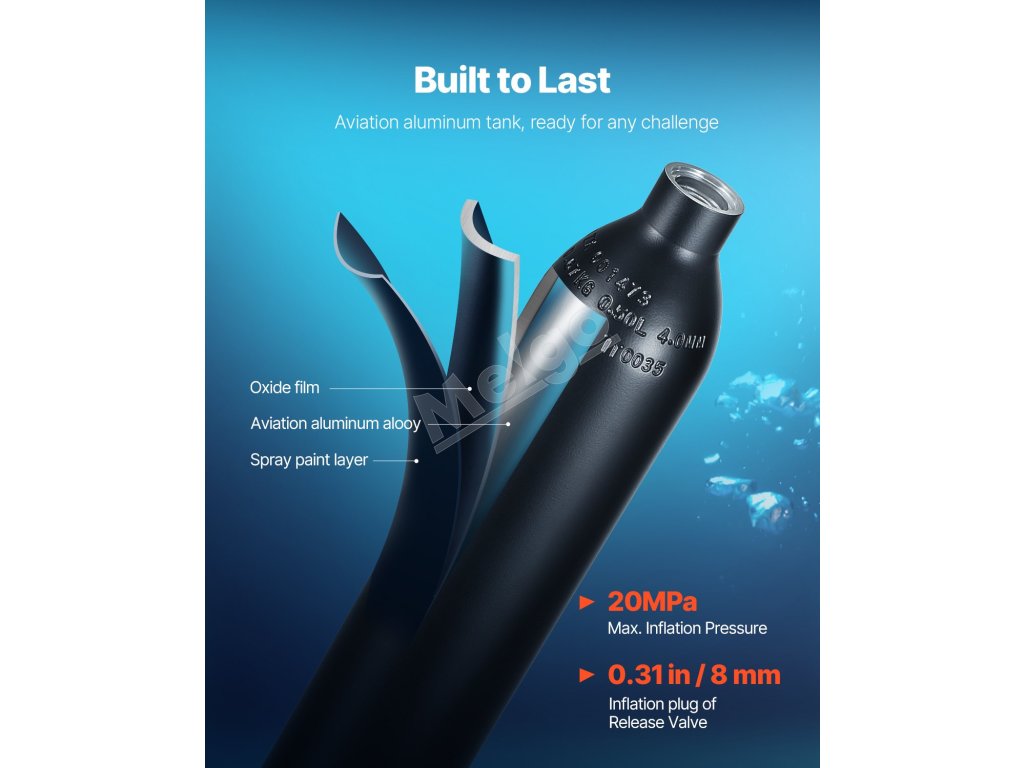 Táto súprava 0,5 l miniatúrnej potápačskej nádrže poskytuje 5 až 10 minút ponoru, čo je ideálne pre začiatočníkov a rekreačných potápačov. Je to skvelý úvod do sveta pod vlnami!