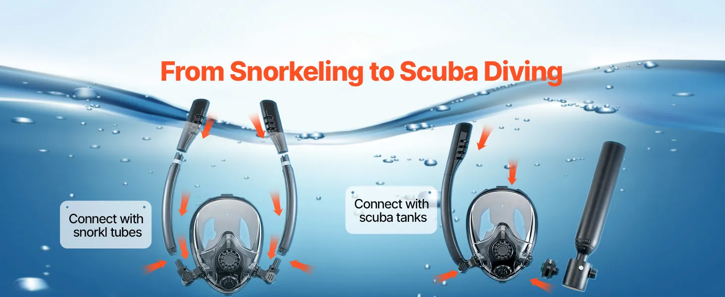 Vďaka vymeniteľným maskám a náustku potápačskej nádrže naša prenosná potápačská nádrž ľahko mení konfigurácie na šnorchlovanie alebo potápanie. Je navrhnutá tak, aby sa prispôsobila vášmu dobrodružstvu.