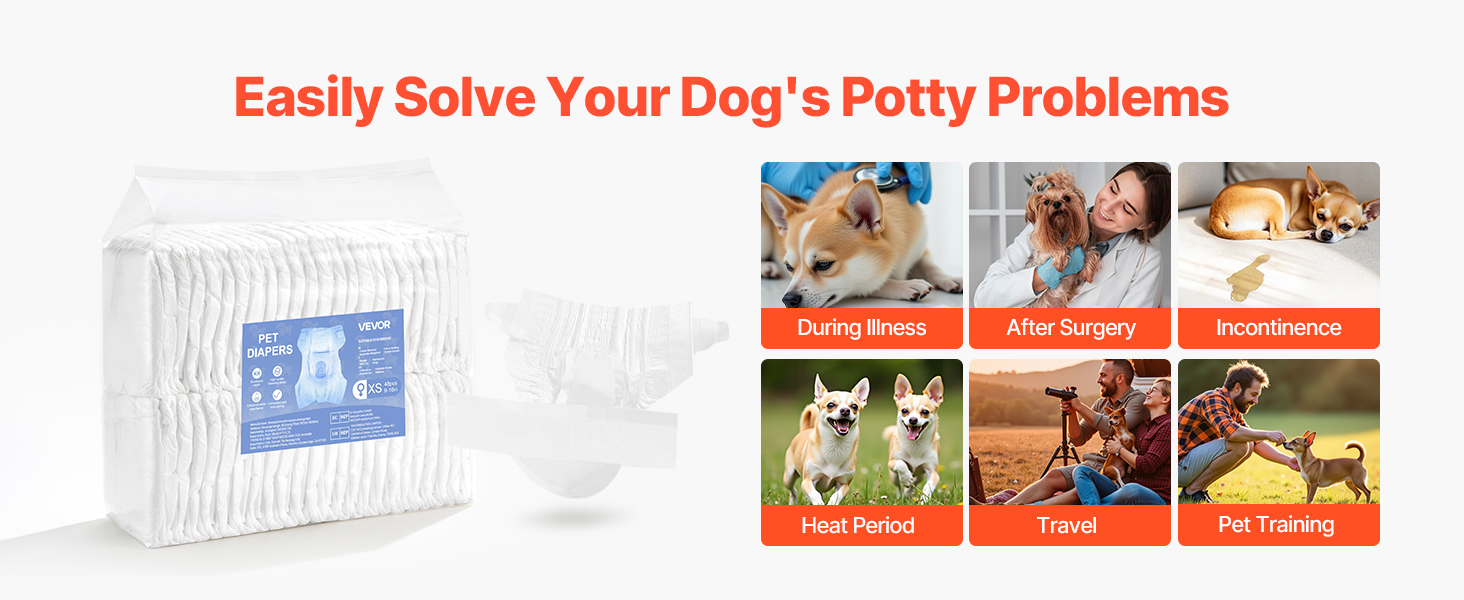 Ideálne pre rôzne situácie, ako je zotavenie z choroby, starostlivosť po operácii, inkontinencia seniorov, cykly tepla, cestovanie a tréning na nočník. Tieto superabsorpčné dámske plienky pre psov uľahčujú každodennú starostlivosť o domáceho miláčika, ľahko riešia problémy s nočníkom vášho psa a vám poskytujú pokoj.