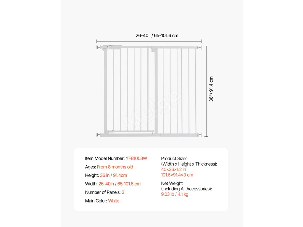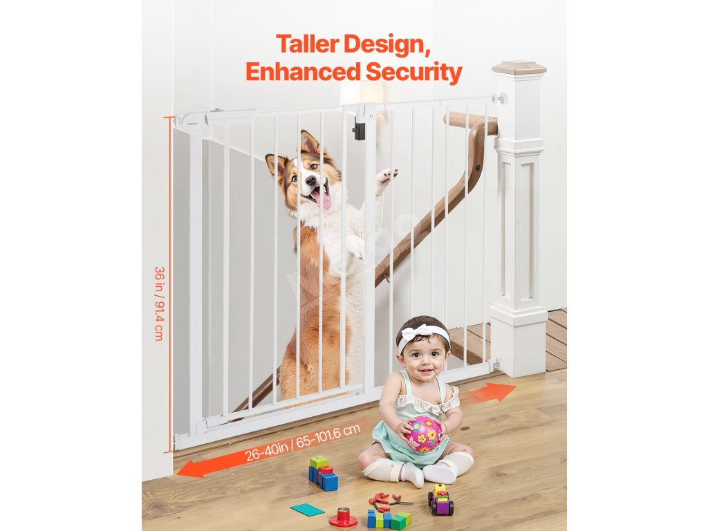 Vďaka výške 36 palcov / 91,4 cm táto bránka pre psov účinne zabraňuje preliezaniu detí a udržiava domáce zvieratá mimo nebezpečných oblastí, čím vytvára bezpečný a chránený priestor na hranie a skúmanie.