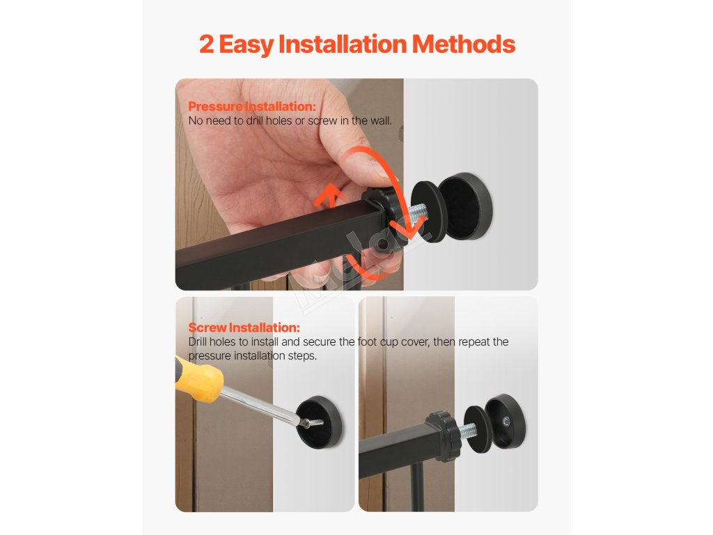 Táto detská bránka má inovatívnu konštrukciu s tlakovou montážou, ktorá si nevyžaduje žiadne vŕtanie, pribíjanie ani nástroje, ktoré by mohli poškodiť steny počas inštalácie, a zachováva tak vaše steny neporušené. Vytvára bezpečné prostredie pre vaše dieťa, čím zaisťuje bezpečnosť pre váš pokoj!