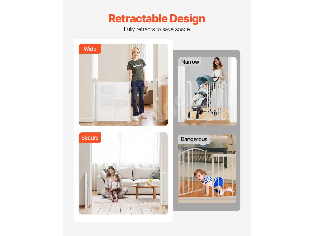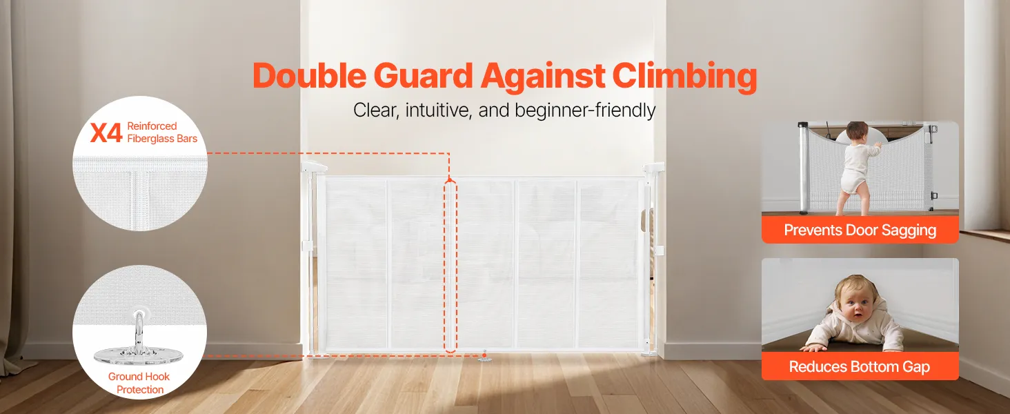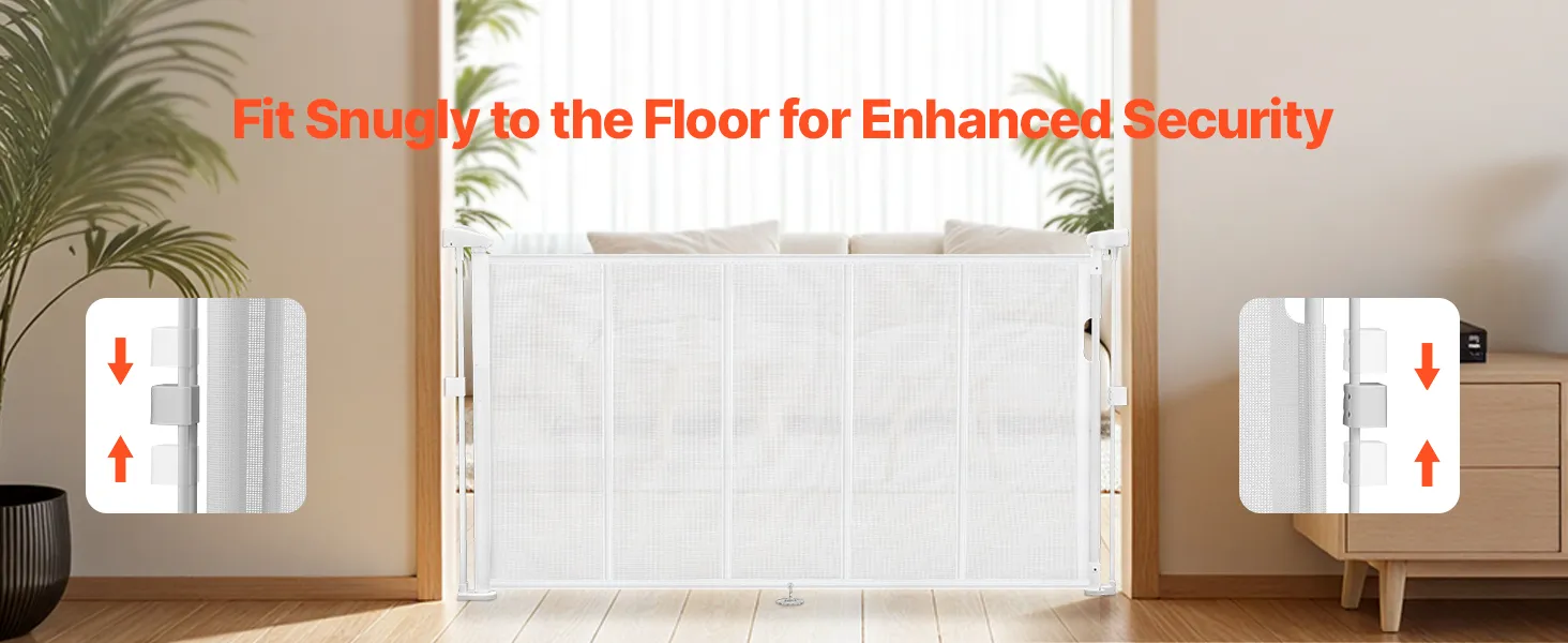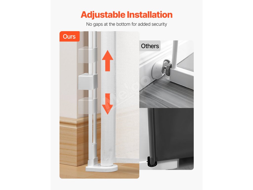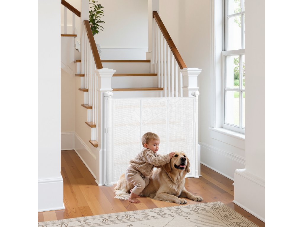 Naše zaťahovacie detské bránky sú vybavené spodnou lištou proti preliezaniu, ktorá zvyšuje úroveň bezpečnosti. Zabezpečuje, že domáce zvieratá alebo deti pod ňou nemôžu ľahko preliezť, čo poskytuje pokoj rodičom a väčšiu bezpečnosť pre domáce zvieratá.