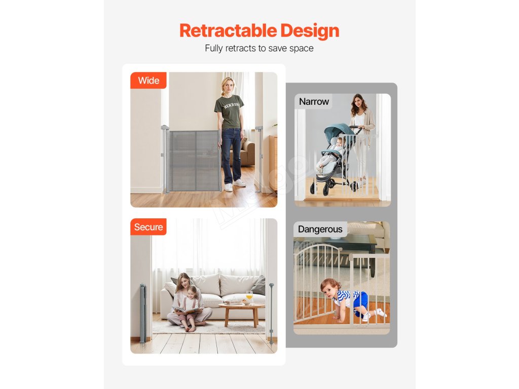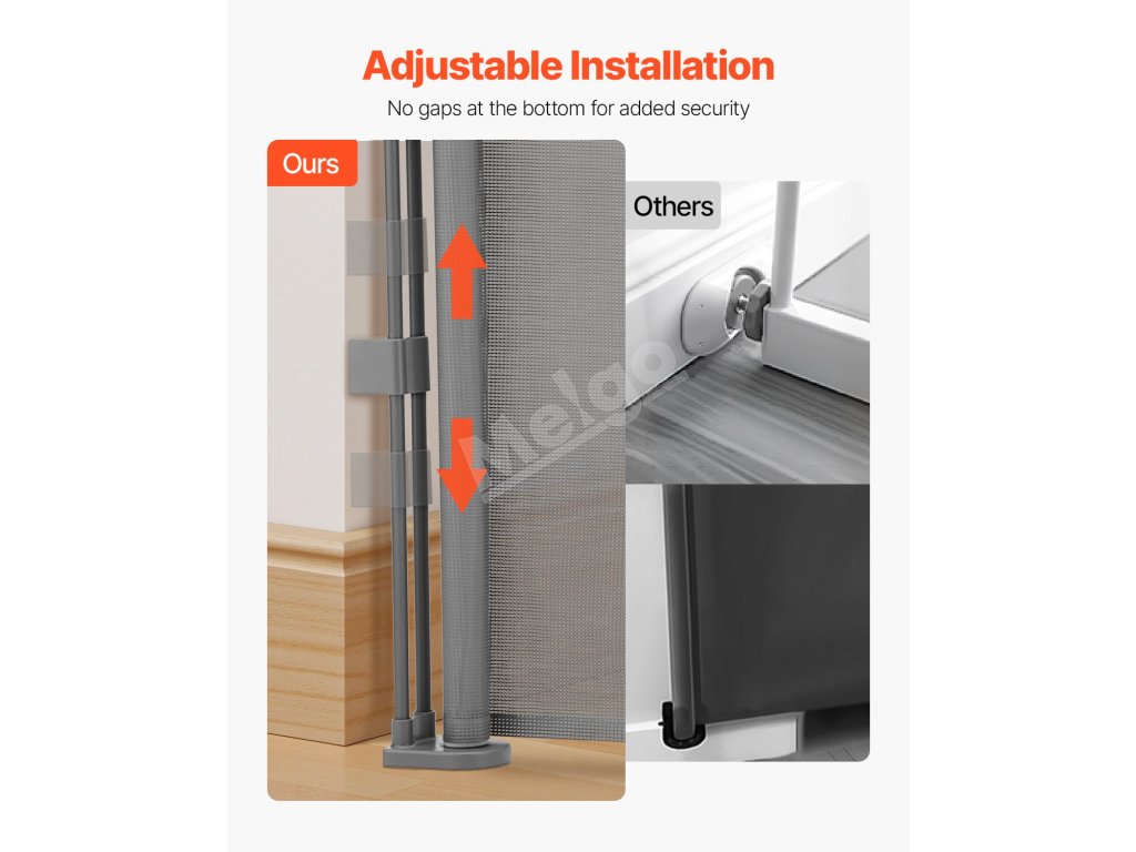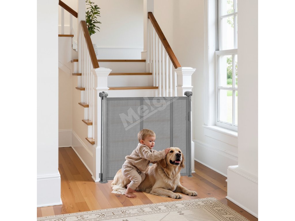 Naše zaťahovacie detské bránky sú vybavené spodnou lištou proti preliezaniu, ktorá zvyšuje úroveň bezpečnosti. Zabezpečuje, že domáce zvieratá alebo deti pod ňou nemôžu ľahko preliezť, čo poskytuje pokoj rodičom a väčšiu bezpečnosť pre domáce zvieratá.