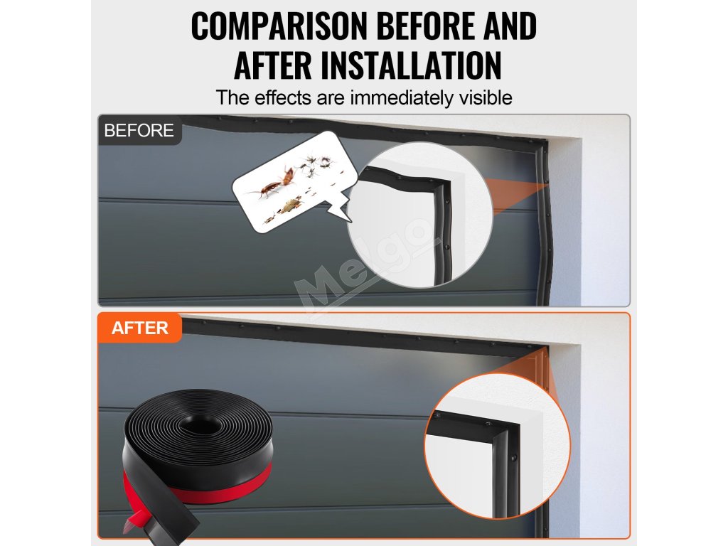 Po inštalácii toto horné a bočné tesnenie garážových dverí účinne zabraňuje prenikaniu prachu, lístia, dažďa, snehu a škodcov cez medzery, čím chráni vaše vozidlo pred vonkajšími vplyvmi a vytvára čistejšie prostredie v garáži.