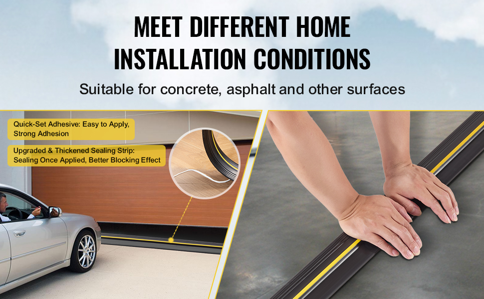 Táto prahová lišta na garážové dvere je vhodná na betónové, asfaltové a lakované povrchy, čím spĺňa potreby rôznych domácností. Vybavený lepidlom zabezpečuje jednoduchú inštaláciu a silnú priľnavosť, čím poskytuje vynikajúci tesniaci účinok.