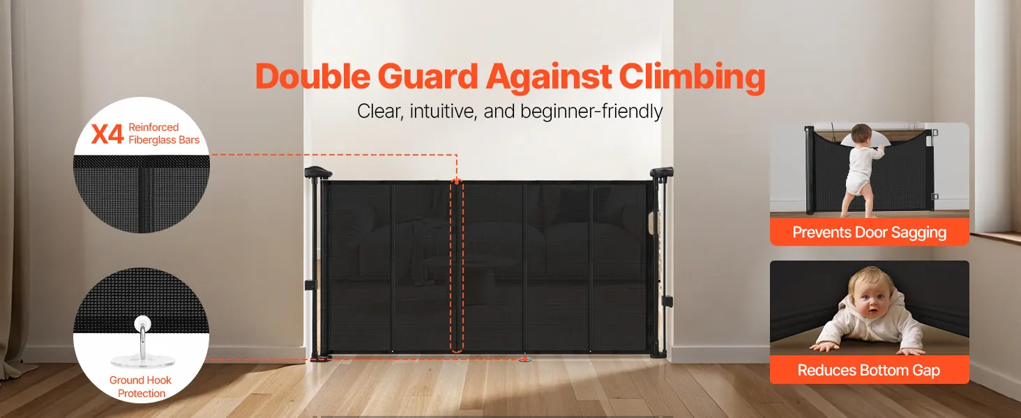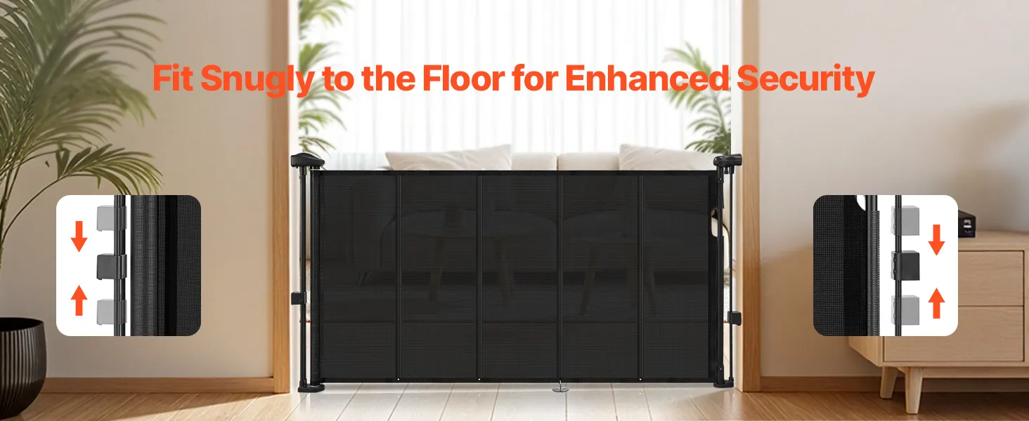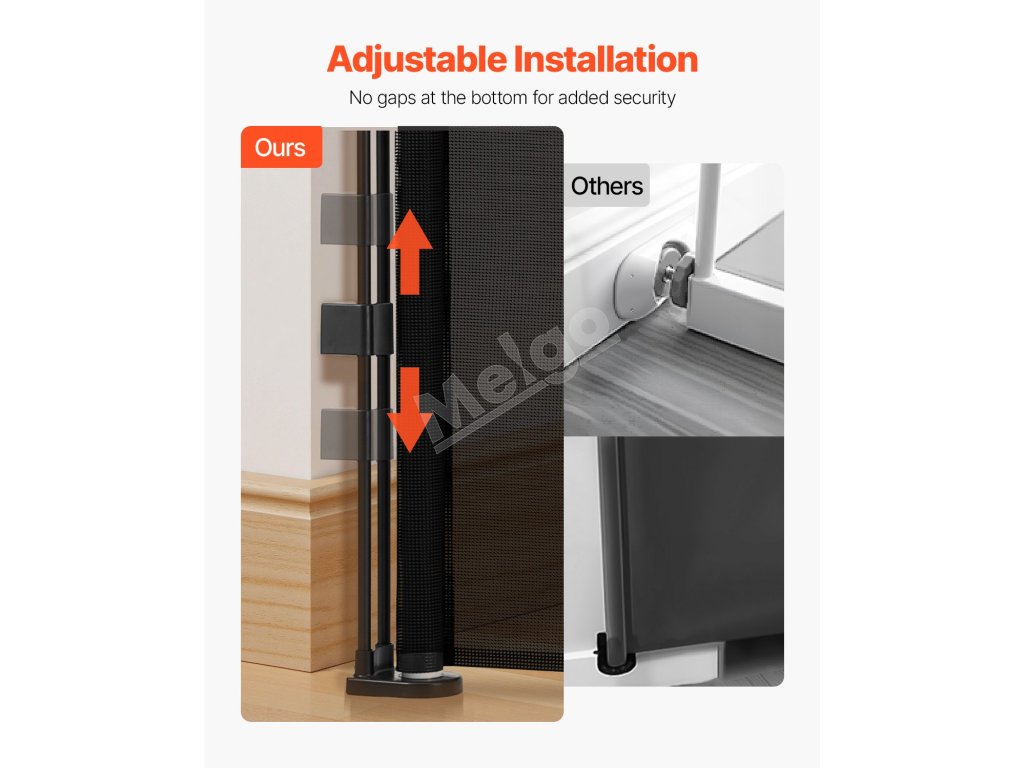 Naše zaťahovacie detské bránky sú vybavené spodnou lištou proti preliezaniu, ktorá zvyšuje úroveň bezpečnosti. Zabezpečuje, že domáce zvieratá alebo deti pod ňou nemôžu ľahko preliezť, čo poskytuje pokoj rodičom a väčšiu bezpečnosť pre domáce zvieratá.