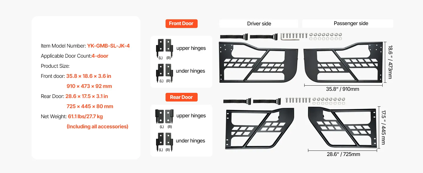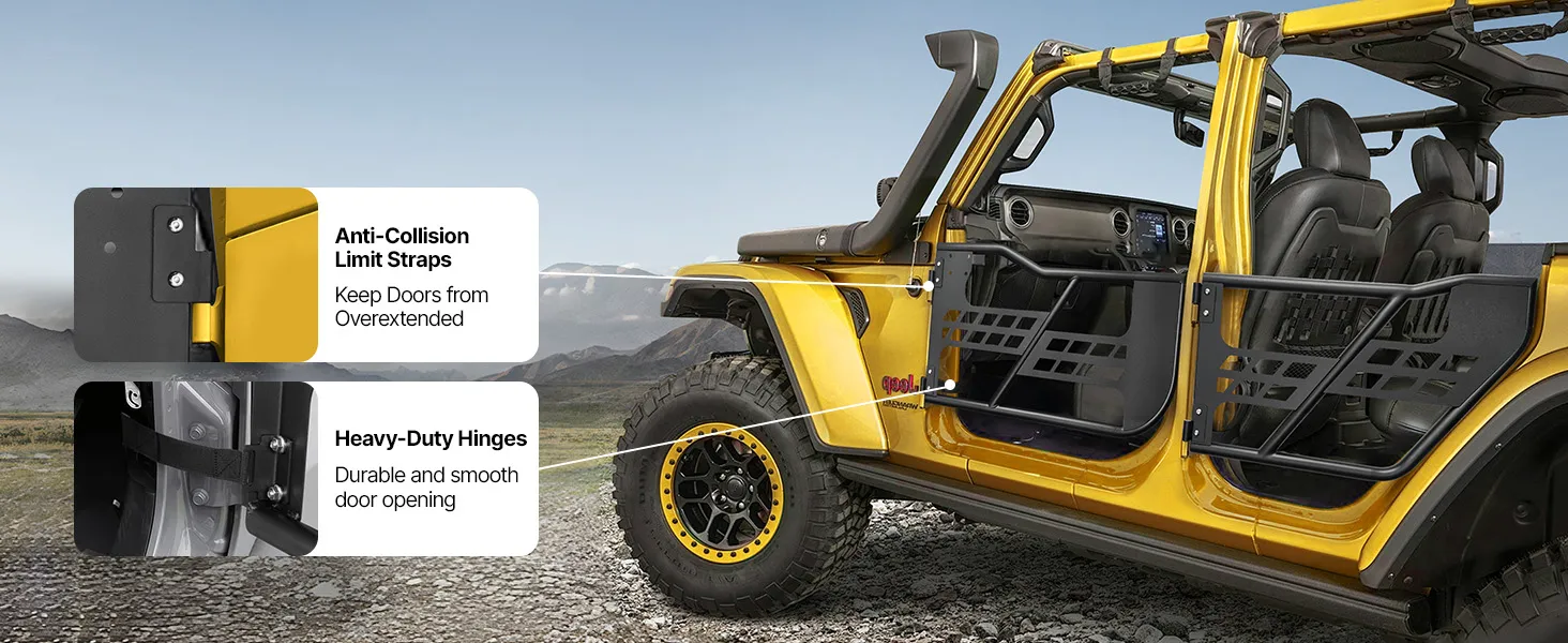 Naše rúrkové dvere Jeep sú ideálnym vylepšením pre dobrodružstvo pod holým nebom. Sú navrhnuté tak, aby pasovali na závesy a západky z výroby, zlepšujú viditeľnosť, zlepšujú prúdenie vzduchu a robia jazdu v teréne citlivejšou a príjemnejšou.