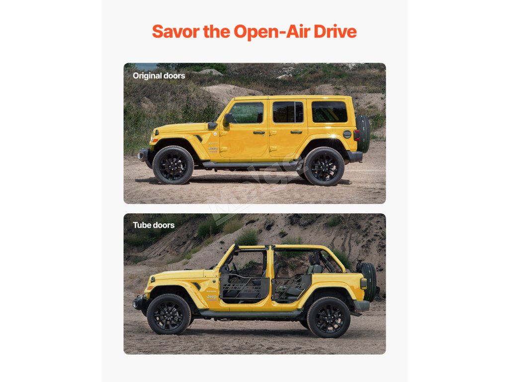 Naše rúrkové dvere Jeep sú ideálnym vylepšením pre dobrodružstvo pod holým nebom. Sú navrhnuté tak, aby pasovali na závesy a západky z výroby, zlepšujú viditeľnosť, zlepšujú prúdenie vzduchu a robia jazdu v teréne citlivejšou a príjemnejšou.