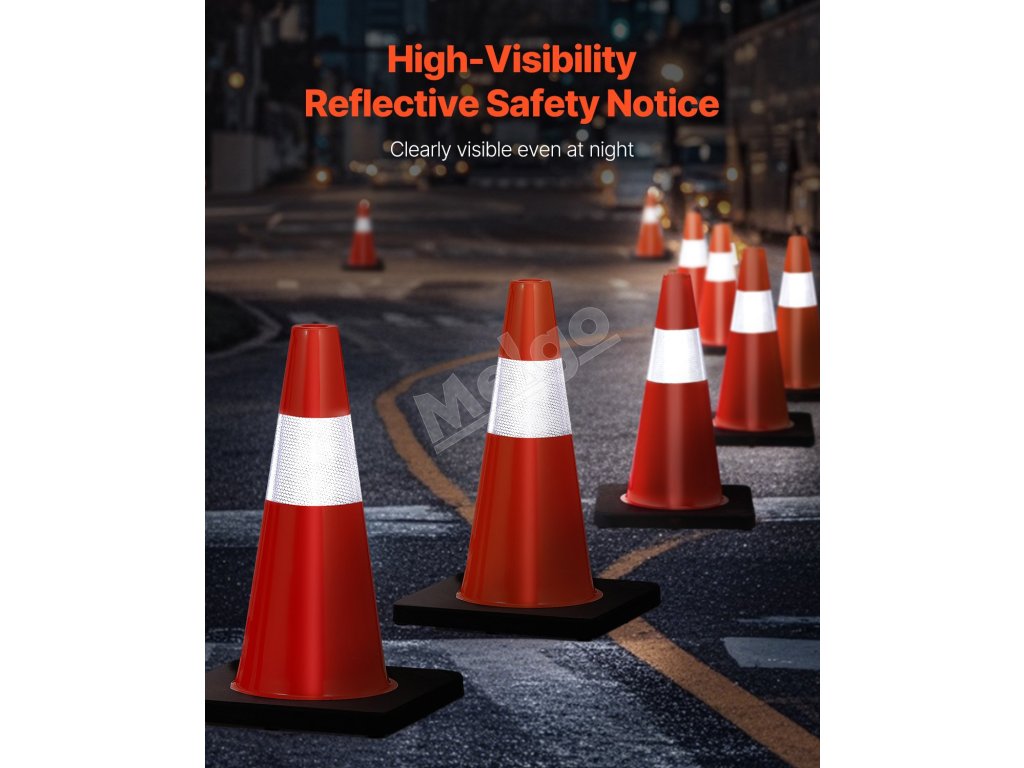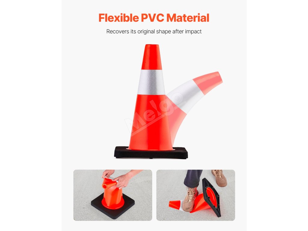 Tieto 18-palcové bezpečnostné kužele sú pevné a nezlomia sa po prejazde autom, pretože sú vyrobené z PVC materiálu. Tento dopravný kužeľ je teda pružný a okamžite sa vráti do štandardného tvaru.