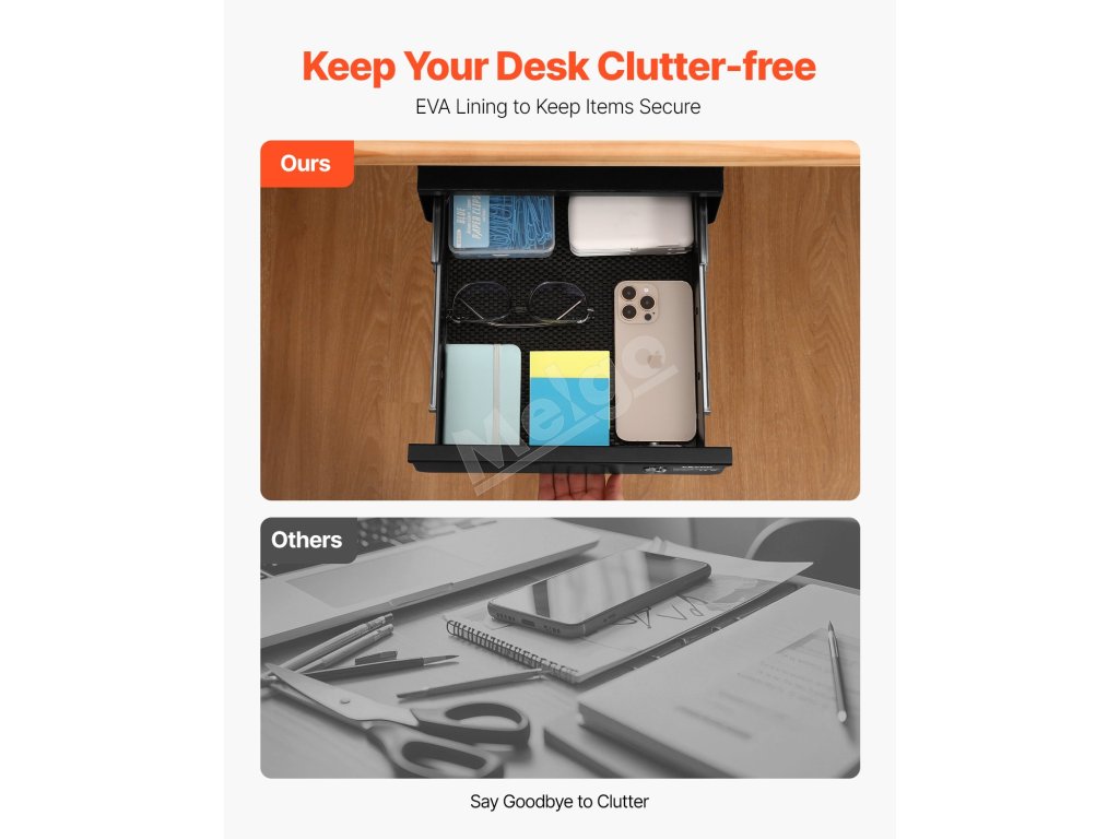 Táto zásuvka pod písacím stolom s nosnosťou 11 libier predstavuje ideálne riešenie na usporiadanie kancelárskych potrieb. Uzamykateľná konštrukcia zaručuje, že vaše osobné veci zostanú v bezpečí. Či už doma alebo v kancelárii, udržiavajte si poriadok na pracovisku a zároveň majte svoje veci usporiadané.