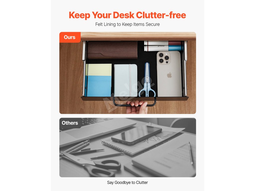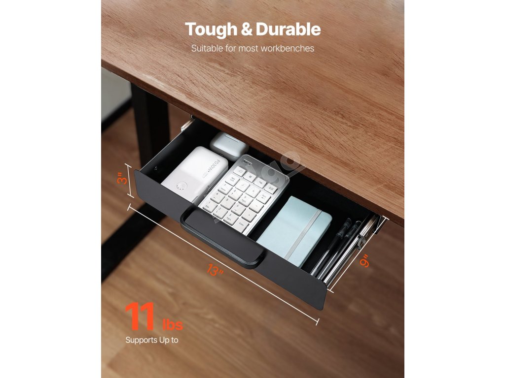 Táto zásuvka pod písacím stolom pojme až 11 kg a poskytne vám cenný dodatočný priestor na pracovnom stole. Udržujte svoj pracovný priestor usporiadaný a bez neporiadku, aby ste sa mohli sústrediť na prácu bez rozptyľovania.