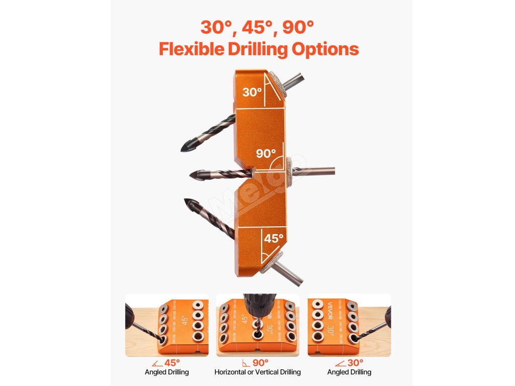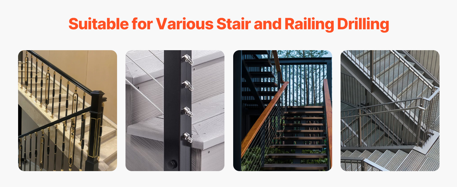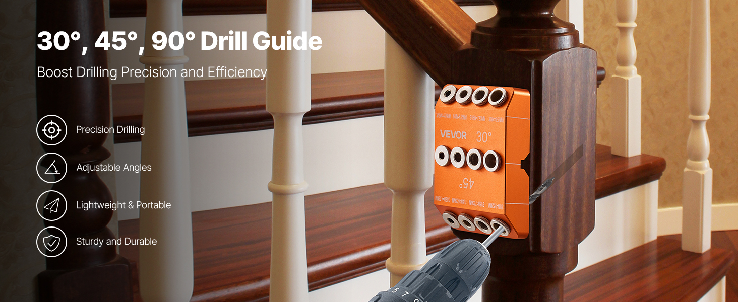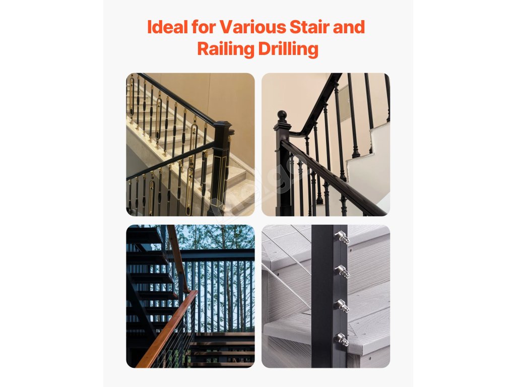 Vďaka viacerým možnostiam uhlov je toto prenosné vŕtacie vodidlo ideálne na inštaláciu zábradlí a plotov, pričom zabezpečuje presné zarovnanie v rôznych materiáloch, ako je drevo, kov a plast.
