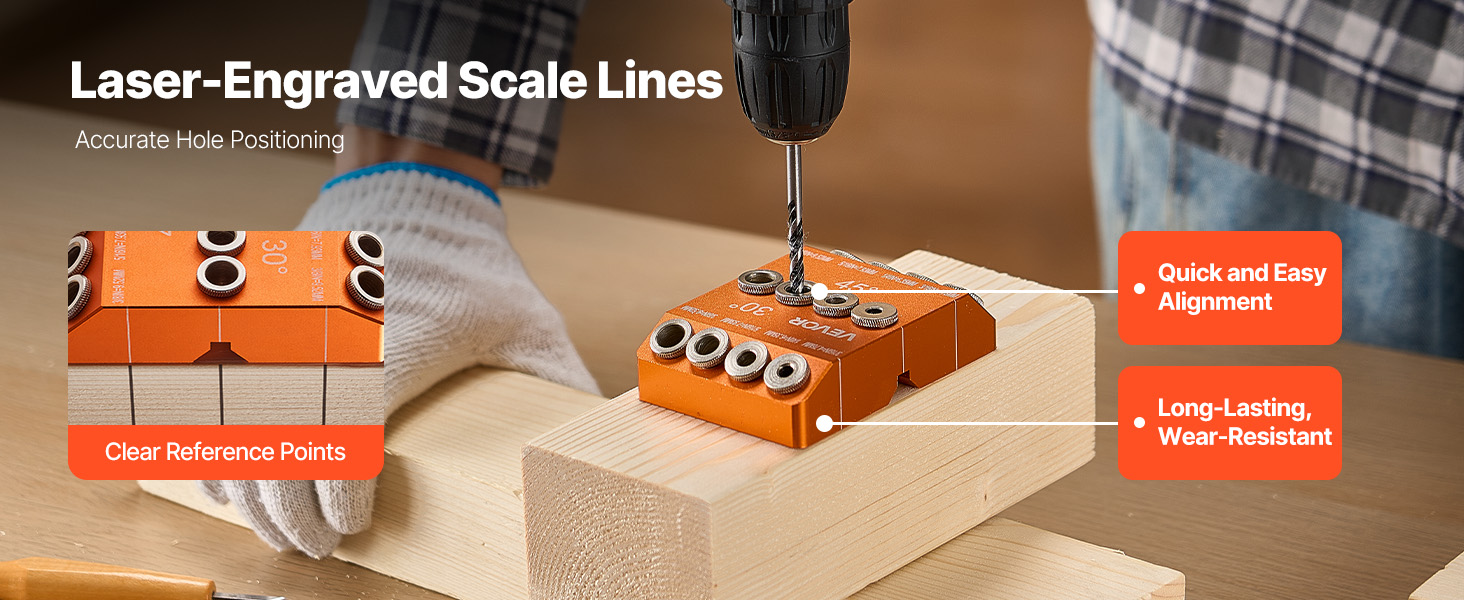 Toto prenosné vŕtacie vodidlo, vybavené priehľadnými stupnicami s laserovým značením odolným proti opotrebovaniu, si pri dlhodobom používaní zachováva presné značenie a zaručuje presnosť aj po opakovaných operáciách.