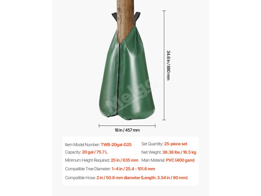 Toto zavlažovacie vrecko na stromy je ideálne pre nové výsadby alebo stromy citlivé na sucho v záhradách a sadoch a zabezpečuje účinné a stabilné zavlažovanie. Vak s veľkou kapacitou 20 galónov (75,7 l) pomaly uvoľňuje vodu v priebehu 5 až 9 hodín, čím hĺbkovo hydratuje korene stromov a podporuje ich zdravý rast.
