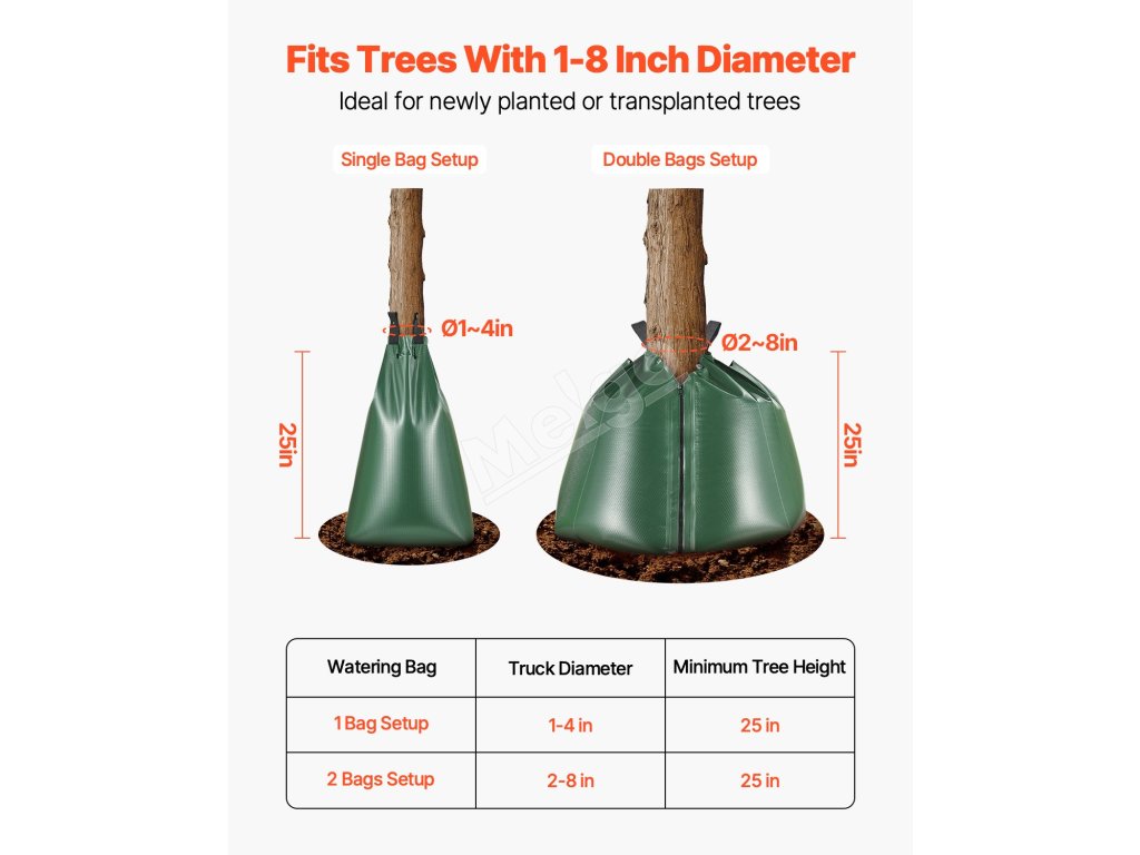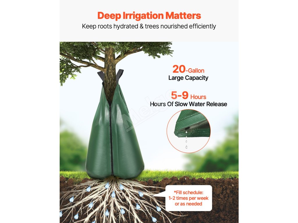 Toto zavlažovacie vrecko na stromy je ideálne pre nové výsadby alebo stromy citlivé na sucho v záhradách a sadoch a zabezpečuje účinné a stabilné zavlažovanie. Vak s veľkou kapacitou 20 galónov (75,7 l) pomaly uvoľňuje vodu v priebehu 5 až 9 hodín, čím hĺbkovo hydratuje korene stromov a podporuje ich zdravý rast.