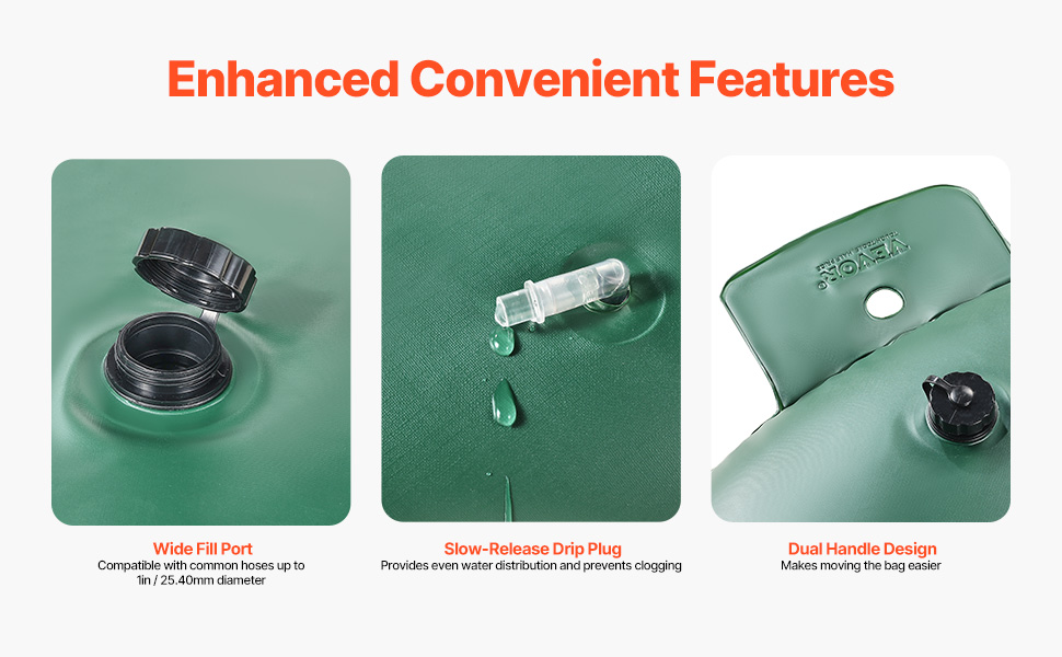 Odvodňovací vývod je vybavený pomaly sa uvoľňujúcim kvapkacím ventilom na rovnomernú distribúciu vody bez upchávania, čo zabezpečuje stabilný prísun vlahy. Konštrukcia s dvojitou rukoväťou uľahčuje premiestňovanie a inštaláciu vaku.