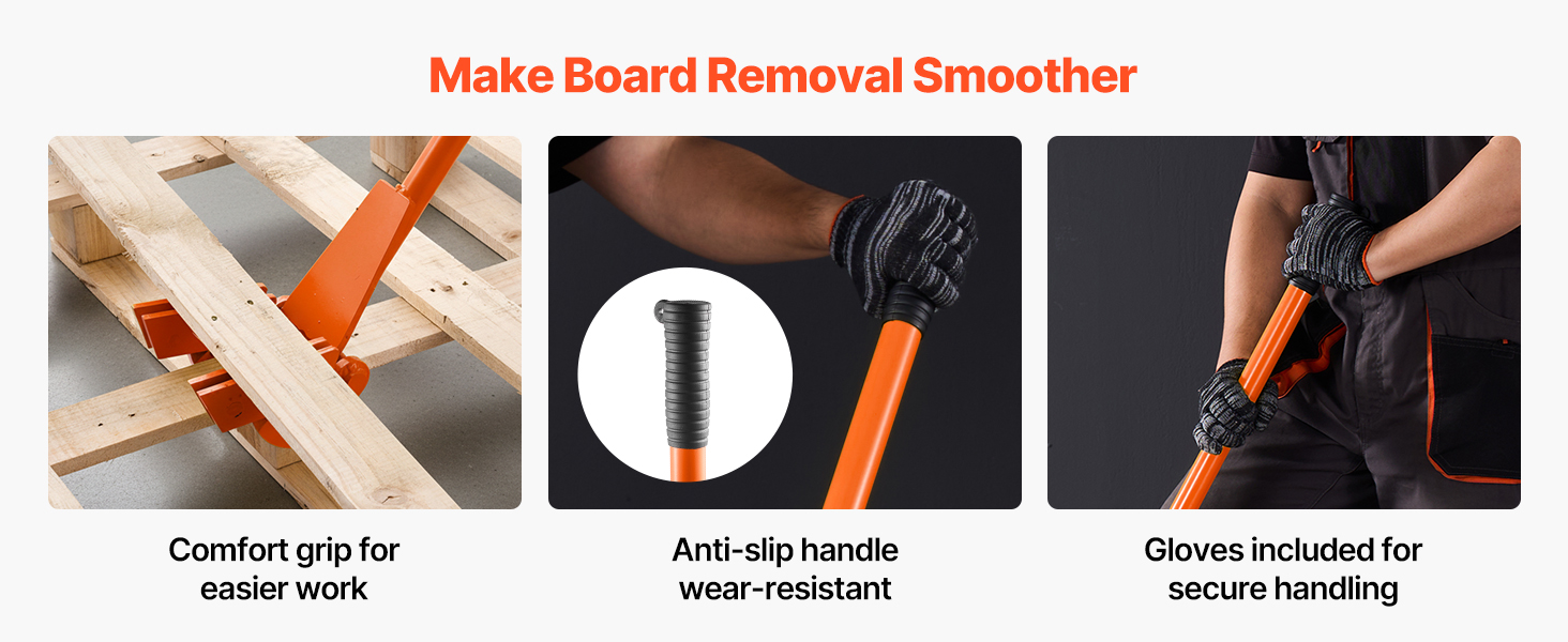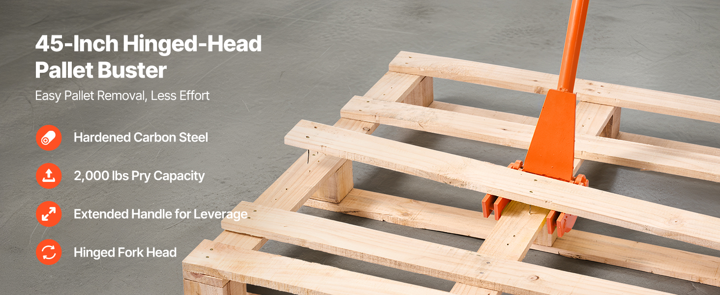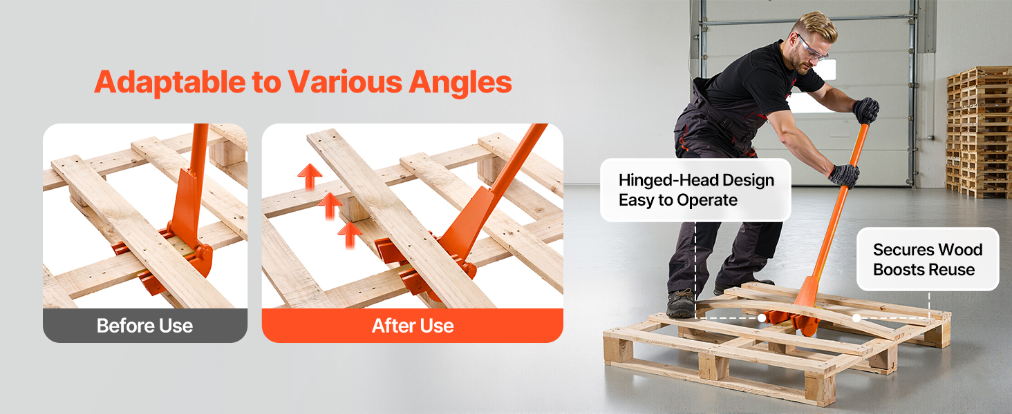 Vsuňte ju do medzier medzi paletami a rýchlo ich rozložte – menej času, menej námahy, menej zlomených dosiek. Tepelne spracovaná uhlíková oceľ 45# poskytuje páčivú silu až 2 000 lb. Univerzálne použitie nevyžaduje žiadnu inštaláciu. Predĺžená ergonomická rukoväť znižuje ohyb a zvyšuje pohodlie a efektivitu.