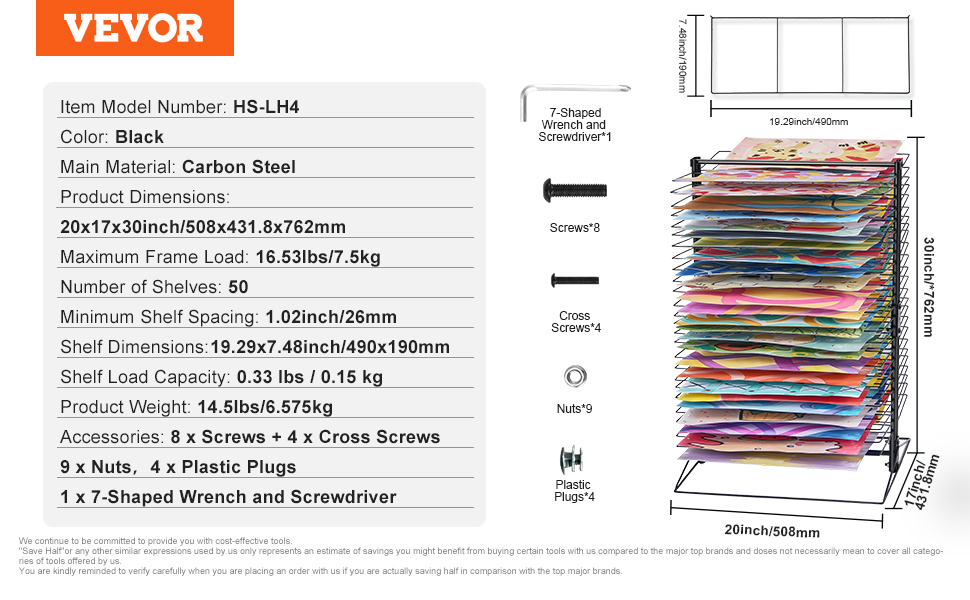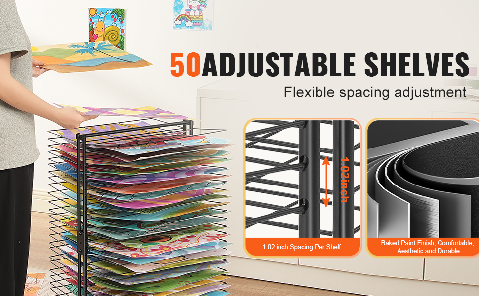 Všetkých 50 políc je nastaviteľných tak, aby vyhovovali rôznym potrebám sušenia, a umožňuje jednoduché vkladanie alebo vyberanie, aby sa zabránilo rozmazaniu mokrých umeleckých diel. Kovová konštrukcia s práškovou povrchovou úpravou zaisťuje hladký každý roh, čím zabraňuje poškriabaniu a zároveň je odolná a estetická.