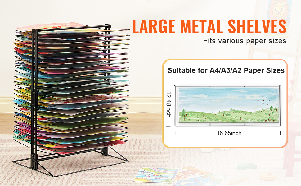 Tento stojan na sušenie obrazov, ktorý je celý vyrobený z kovu, je konštruovaný tak, aby udržal veľké množstvo umeleckých diel bez toho, aby sa ohýbal alebo deformoval. Do políc možno umiestniť rôzne veľkosti papiera vrátane formátov A4, A3 a A2. Aj pri plnom zaťažení si zachováva stabilitu bez rizika zrútenia.