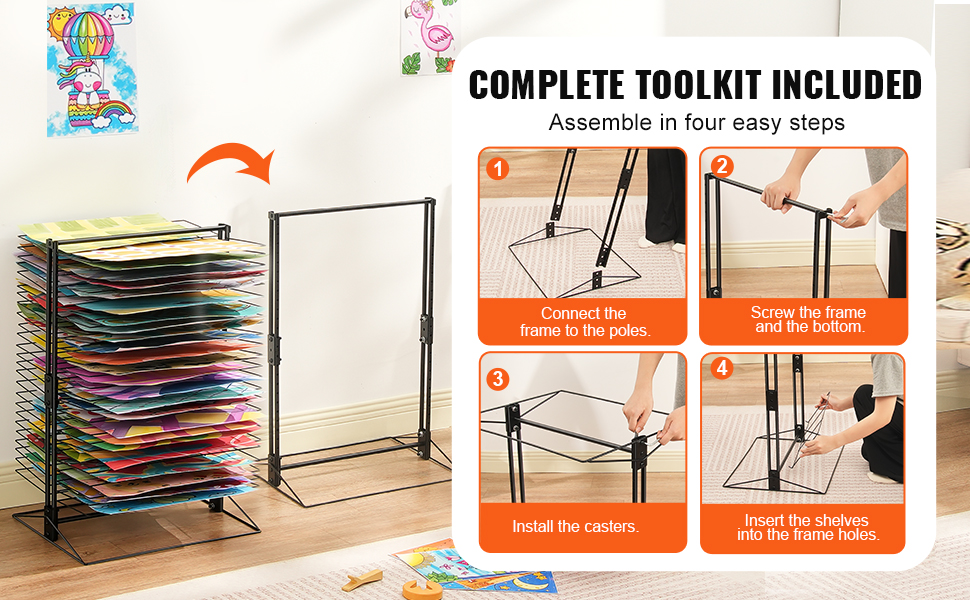 Jednoducho dokončite nastavenie v štyroch krokoch. Stojan na sušenie umeleckých predmetov do učebne obsahuje sadu nástrojov na inštaláciu a návod, takže nie sú potrebné žiadne ďalšie nástroje. Po rýchlej demontáži zaberá minimum miesta, zmestí sa aj do rohov, znižuje neporiadok vo vašej domácnosti a udržiava poriadok v priestore.