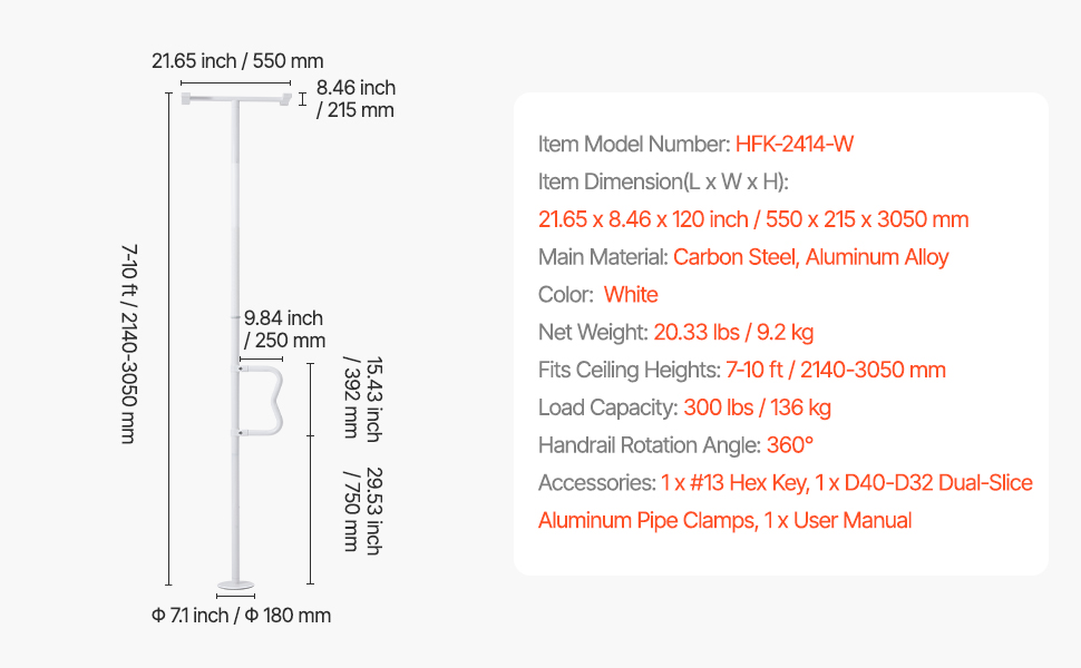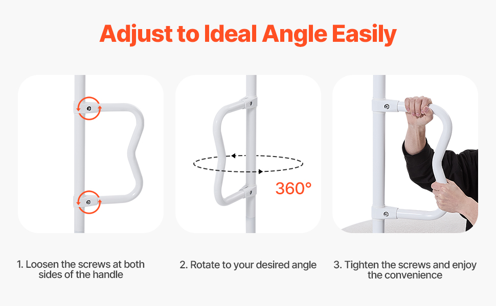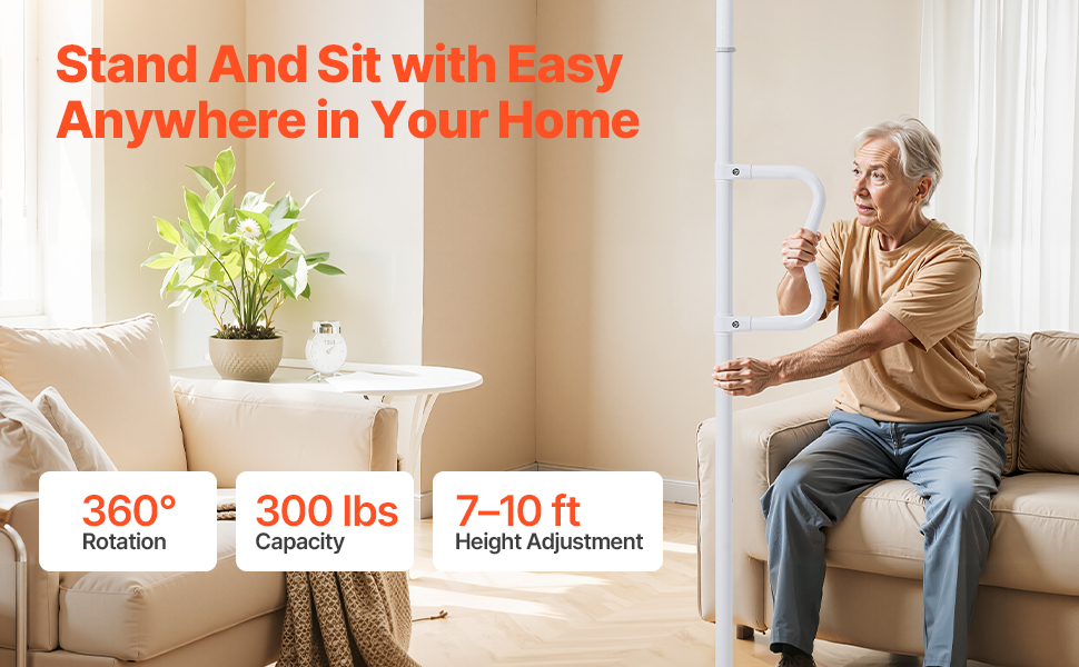 Naše madlo od podlahy k stropu má robustnú nosnosť 300 kg, čo zaručuje použitie v spálni, kúpeľni, na toalete atď. Vďaka nastaviteľnej výške 7-10 stôp sa nemusíte obávať výšky stropu. Otáča sa o 360° s intervalmi uzamknutia 45°, pričom nastavením skrutiek ponúka ideálny uhol opory.