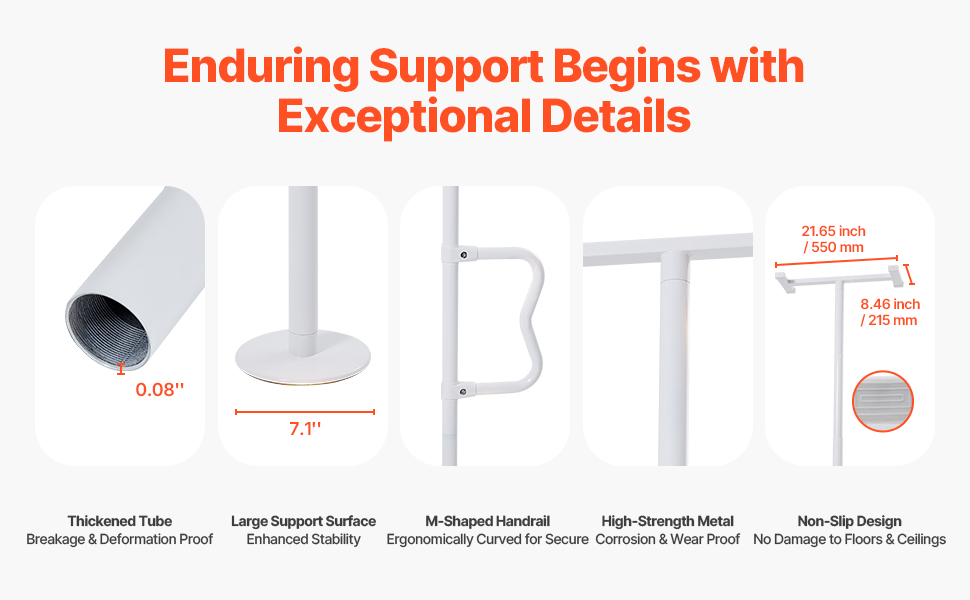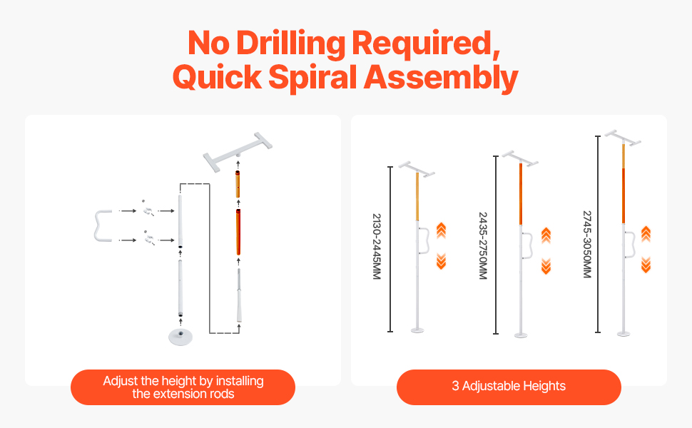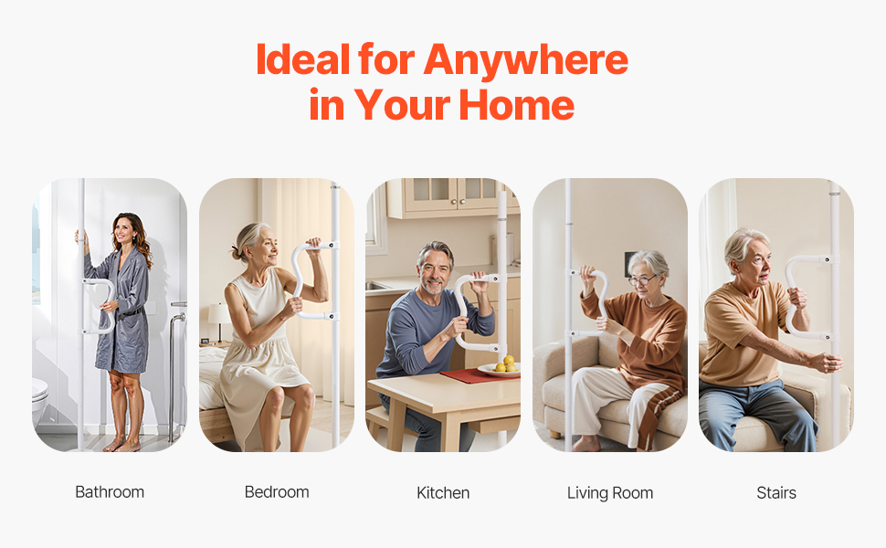 Montážou predlžovacích dielov ponúka táto nastaviteľná tyč od podlahy k stropu 3 výškové nastavenia, ktoré sú vhodné na inštaláciu v kúpeľniach, spálňach a obývacích izbách. Dá sa rýchlo rozobrať a opäť zložiť na použitie v rôznych prostrediach, čím sa prispôsobí členom rodiny s obmedzenou pohyblivosťou.