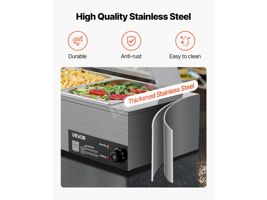 Tento 3-panvičkový ohrievač jedál z nehrdzavejúcej ocele so skleneným krytom je vybavený systémom proti spáleniu nasucho a tlačidlom reset na ochranu pred poškodením. Teplotný rozsah 86 - 185℉ / 30 - 85 ℃ vám umožní vybrať si ideálne nastavenie pre vaše jedlo, ktoré bude kedykoľvek teplé a pripravené na podávanie.